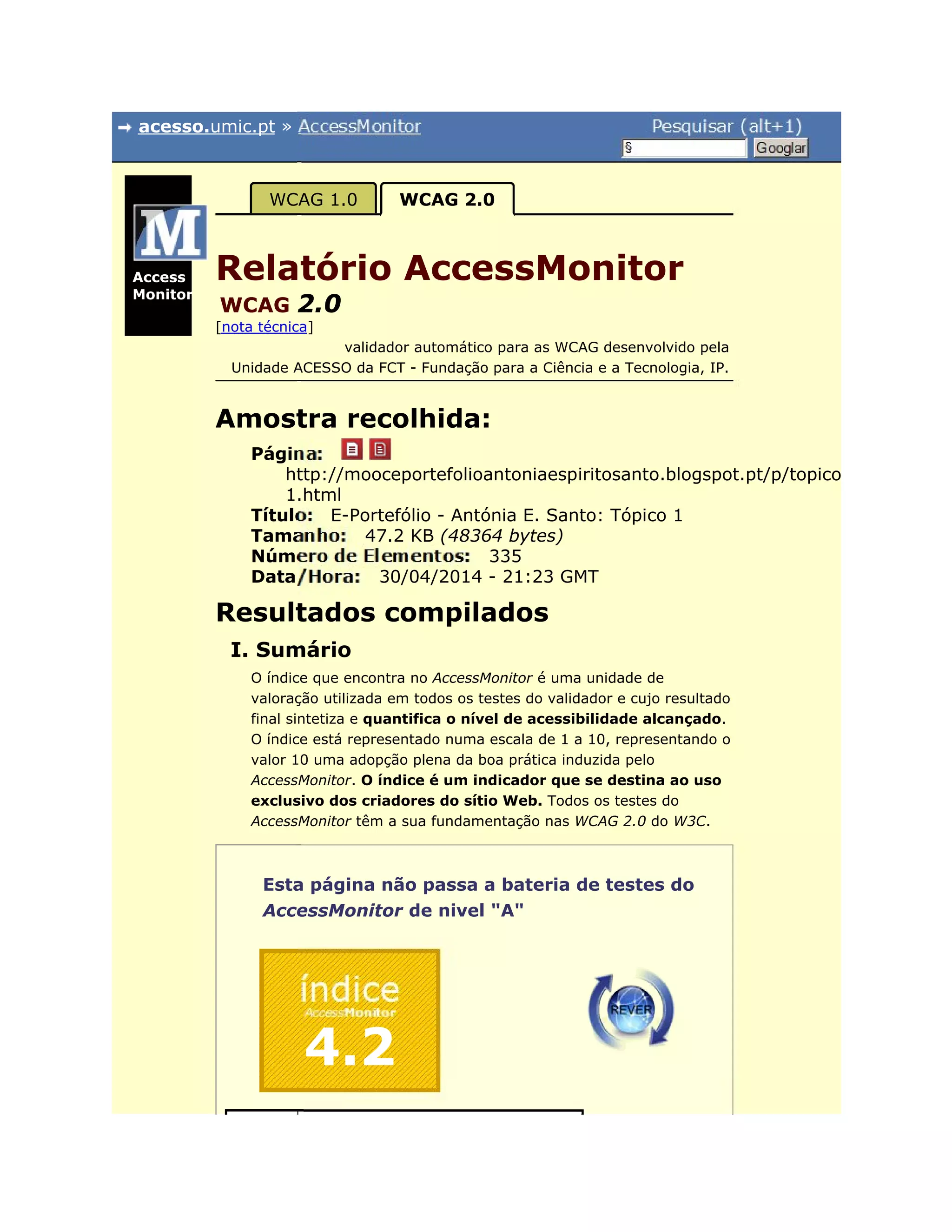 O documento apresenta os resultados de um teste de acessibilidade realizado pelo validador AccessMonitor a uma página web. O teste encontrou vários erros e problemas relacionados com falta de legendas em imagens, ausência de títulos em frames, erros de codificação HTML e uso inadequado de tabelas. No geral, a página falha os requisitos de acessibilidade de nível A definidos nas WCAG 2.0.