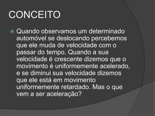 A aceleração é a taxa de variação da velocidade em relação ao tempo e é medida em m/s2. No movimento retilíneo uniforme a aceleração é nula, enquanto no movimento retilíneo uniformemente variado a velocidade varia de forma uniforme. A aceleração média é calculada pela fórmula am = ΔV/Δt, onde ΔV é a variação de velocidade e Δt o intervalo de tempo.