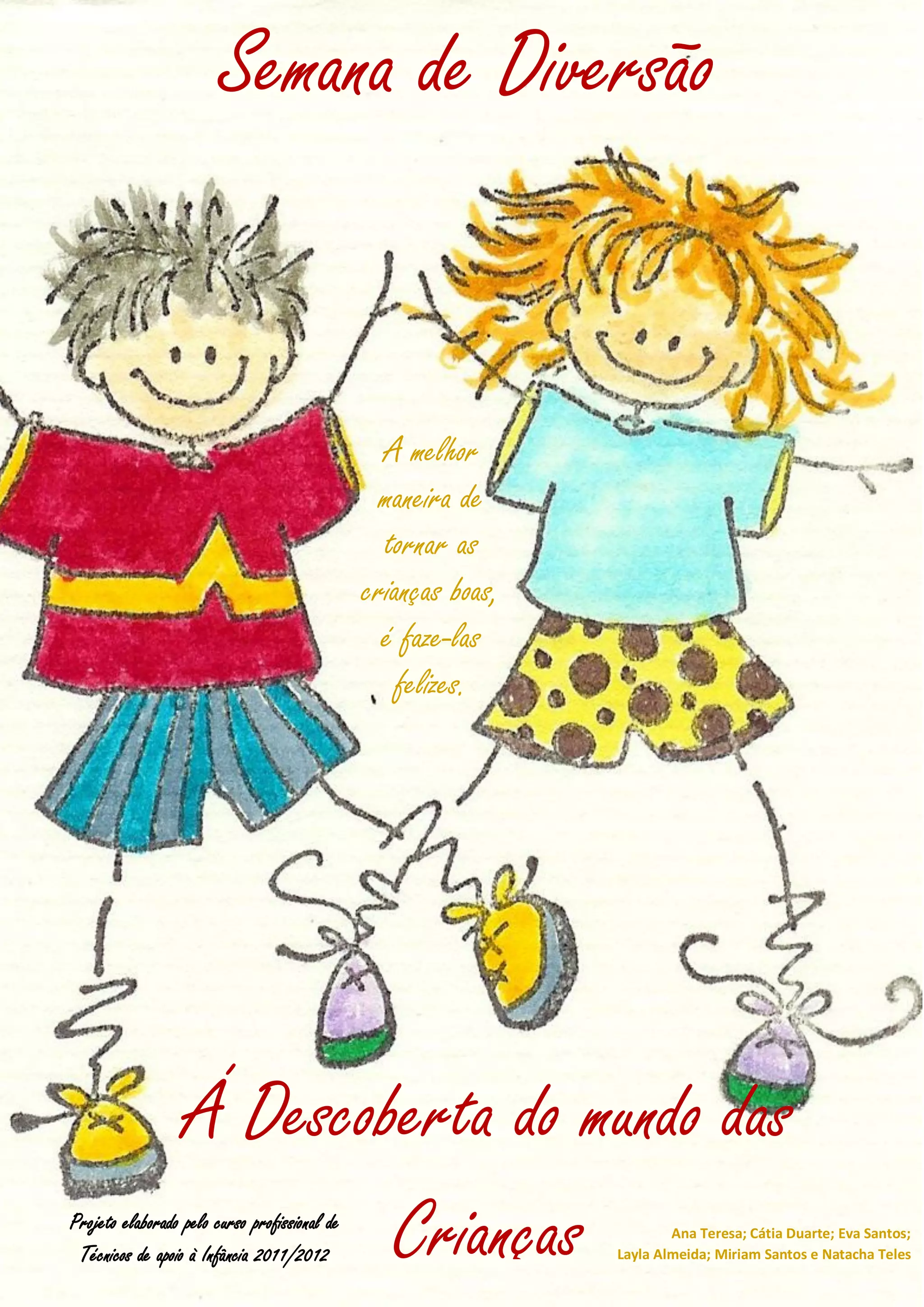 O documento propõe uma semana de diversão para crianças com o objetivo de torná-las felizes e explorar o mundo de forma lúdica. Foi elaborado por alunas do curso de Técnicos de apoio à Infância para proporcionar atividades que estimulem o desenvolvimento das crianças de forma prazerosa.
