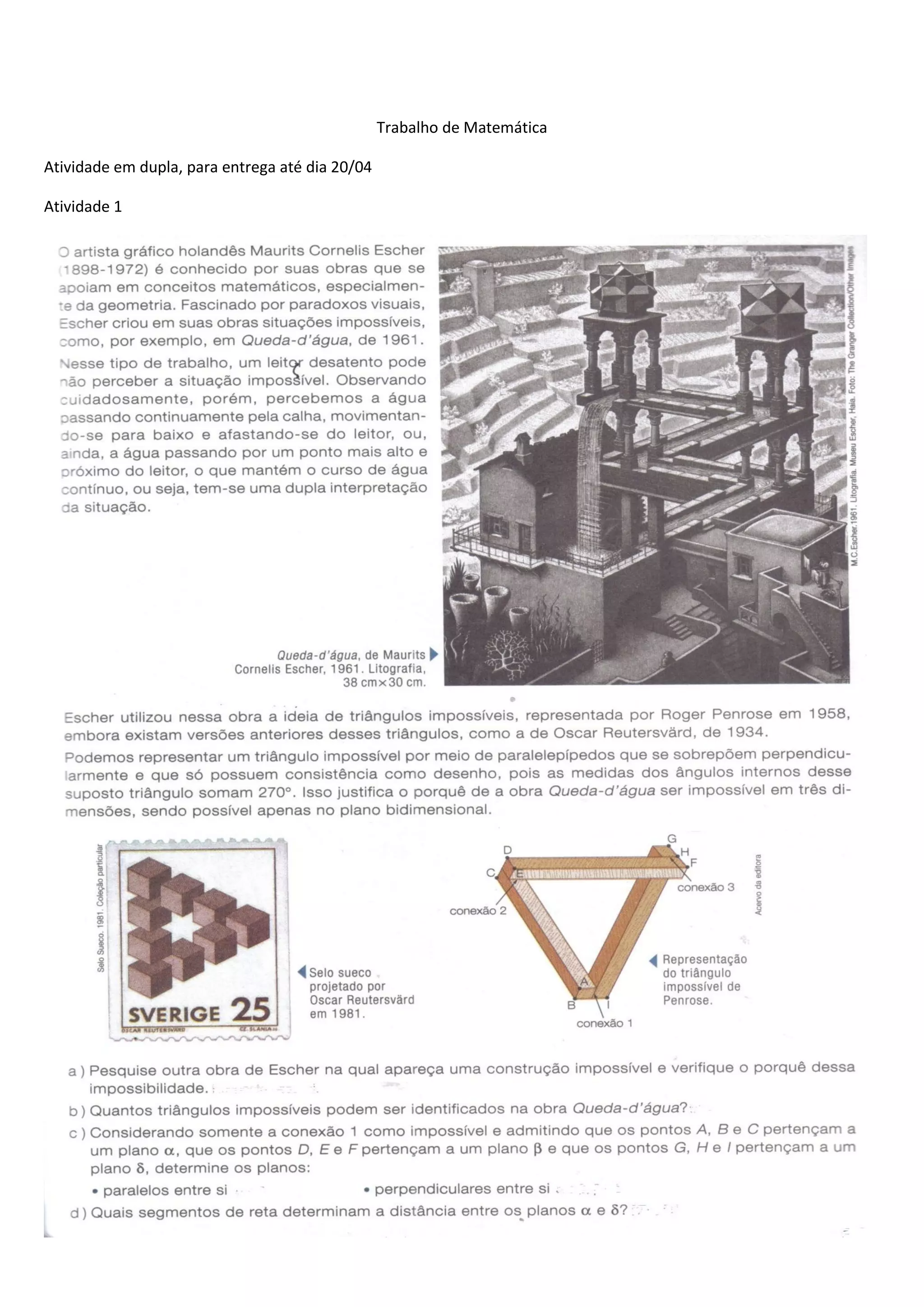 Esta atividade de matemática em dupla consiste em duas tarefas: 1) Pesquisar e comentar sobre uma obra do artista Escher devendo ser entregue até 20/04, 2) Fotografar uma figura 3D na cidade e construir um modelo de maquete com materiais recicláveis identificando formas geométricas, incluindo a foto na apresentação.