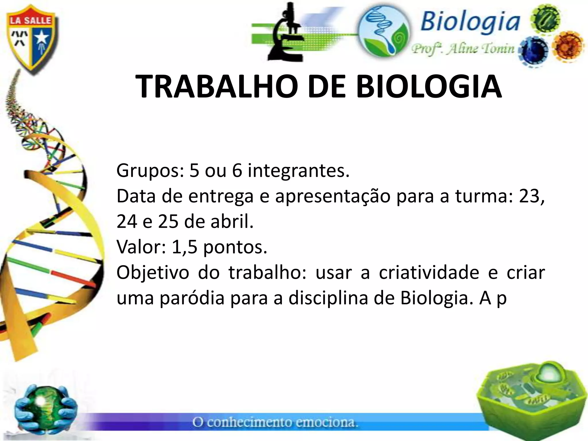 Os alunos devem formar grupos de 5 a 6 pessoas para criar uma paródia musical sobre um tópico de biologia sorteado, a ser entregue como vídeo até 23-25 de abril e apresentada para a turma. O trabalho vale 1,5 ponto e deve usar uma música conhecida como base para ensinar de forma criativa sobre o assunto designado.