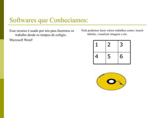 O documento descreve como os alunos aprenderam a usar novos softwares e dispositivos durante o curso, incluindo Microsoft PowerPoint, Microsoft Office, pendrives, impressoras, chats online e blogs. Também discute como as ferramentas de comunicação online como MSN e Google permitem a interação em tempo real.