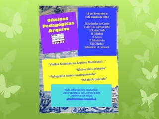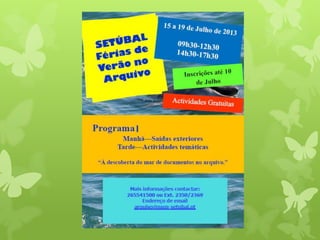 O documento descreve as atividades realizadas pelo Arquivo Municipal de Setúbal entre fevereiro e setembro de 2013, incluindo oficinas pedagógicas, eventos para o Carnaval, Páscoa, projetos educativos sobre o património documental local e oficinas de verão.