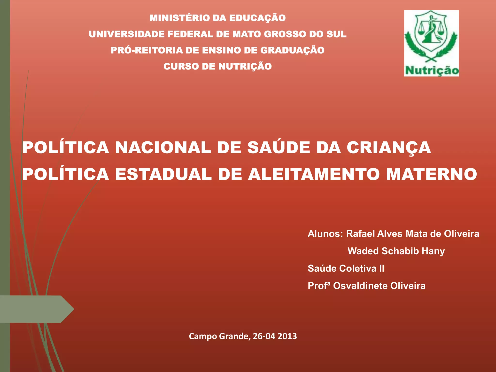 O documento discute as políticas nacionais e estaduais de saúde da criança e aleitamento materno no Brasil, com foco nas estratégias de promoção da saúde infantil, prevenção de doenças, e incentivo ao aleitamento materno exclusivo até 6 meses.