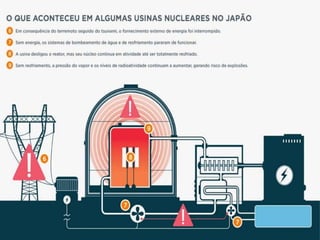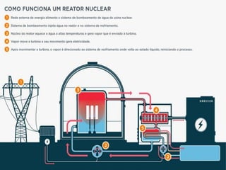 O documento descreve o que é uma usina nuclear, seu funcionamento, vantagens e desvantagens. As usinas nucleares produzem eletricidade a partir da energia liberada por reações nucleares controladas e usam o calor gerado para mover turbinas. Embora sejam fontes de energia limpa, apresentam riscos como vazamentos radioativos e geram resíduos nucleares de difícil tratamento.