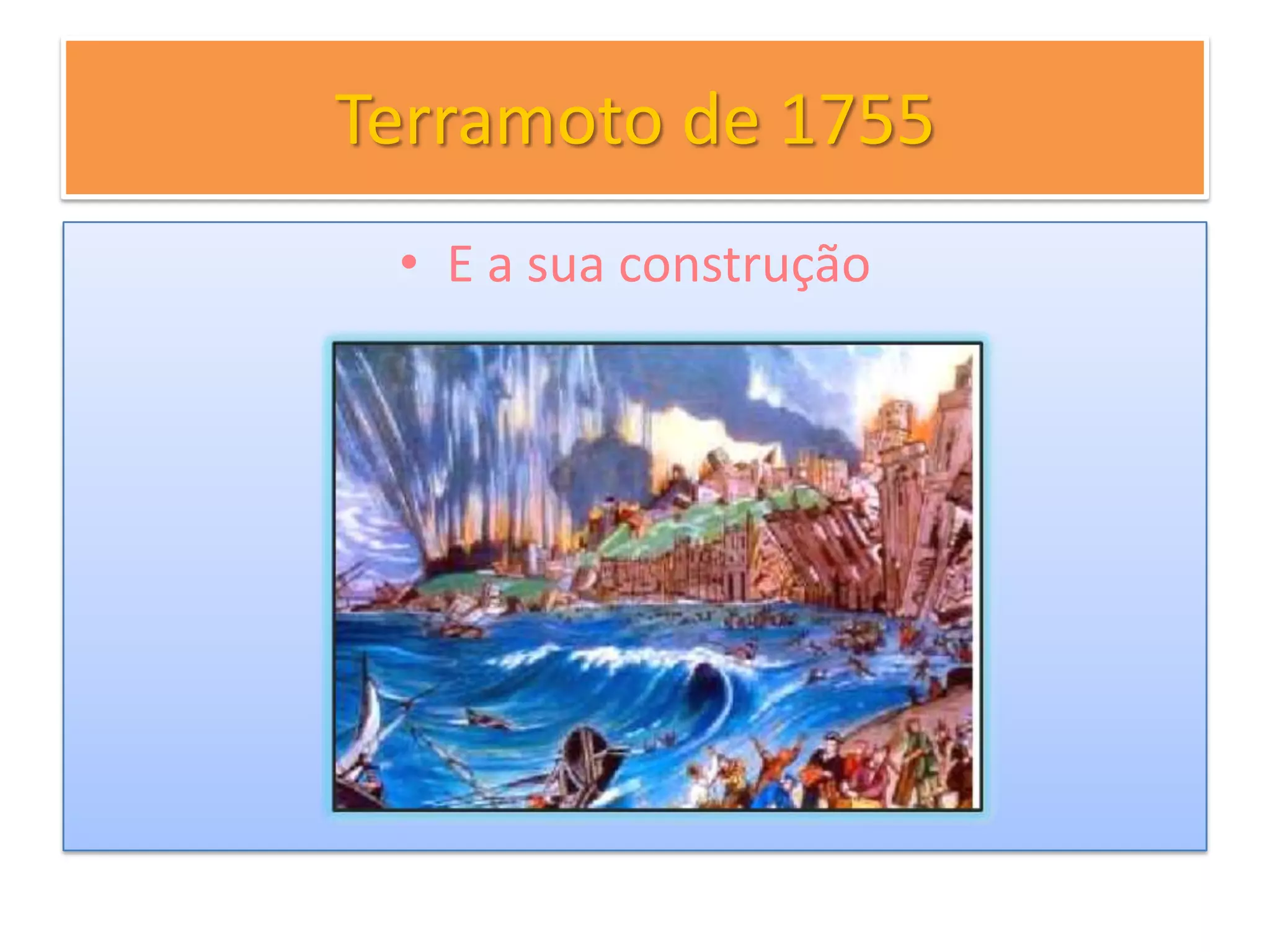 O sismo de 1755 destruiu grande parte de Lisboa e causou muitas mortes. A família real e o Marquês de Pombal sobreviveram. Pombal liderou a reconstrução da cidade com ruas retas e prédios de mesma altura para resistir a sismos futuros. A nova Baixa Pombalina tinha infraestrutura melhorada.