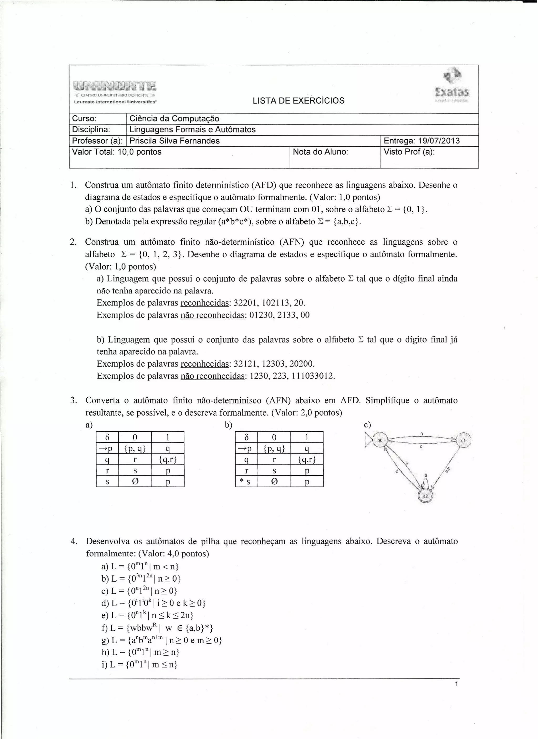 O documento apresenta uma lista de exercícios de Teoria dos Autômatos para o curso de Ciência da Computação. Os exercícios incluem: (1) construção de autômatos finitos determinísticos e não-determinísticos para reconhecer linguagens regulares; (2) conversão de autômato finito não-determinístico para determinístico; e (3) desenvolvimento de autômatos de pilha para reconhecer linguagens de pilha.