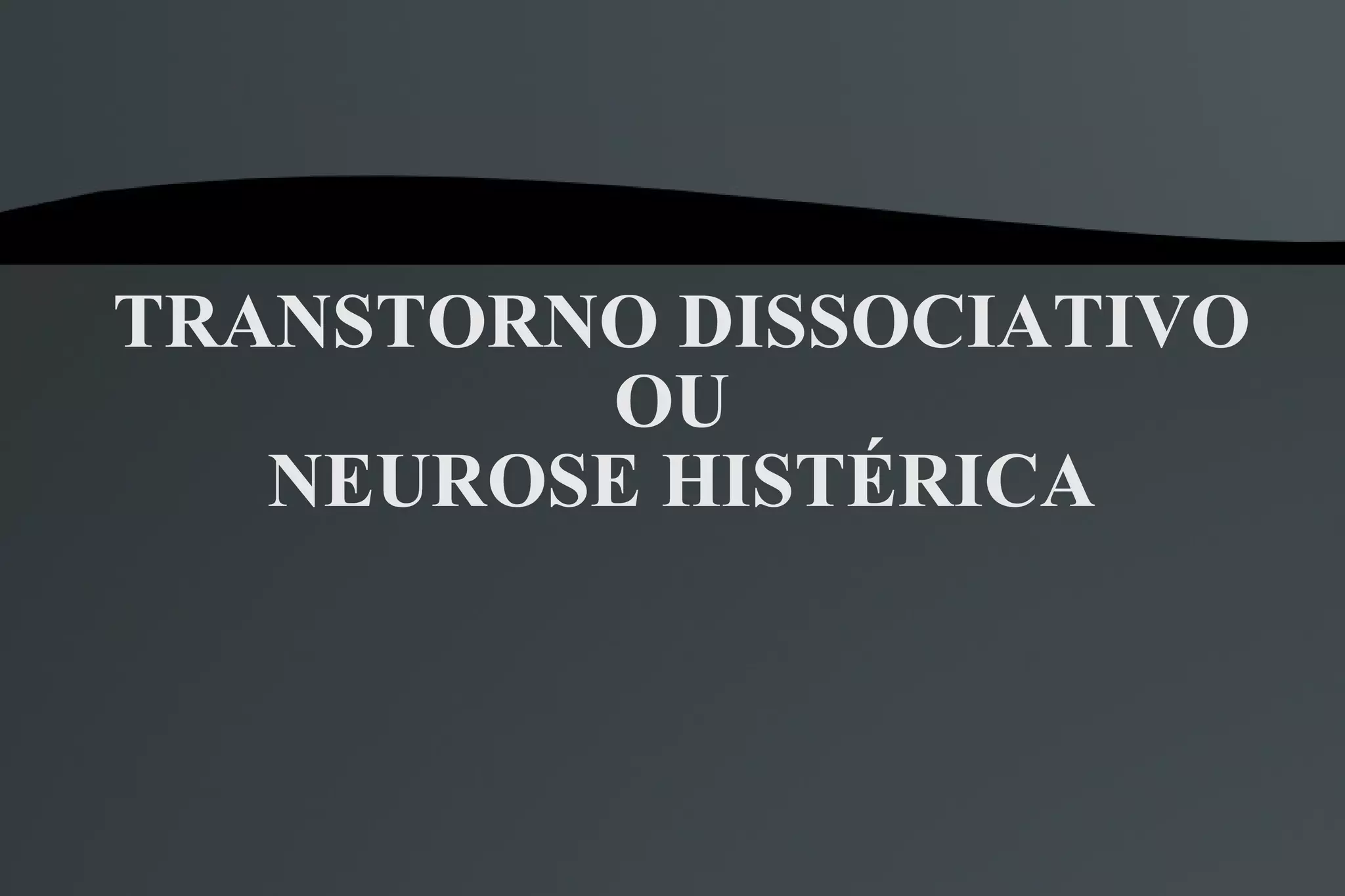 O documento discute o transtorno dissociativo, também conhecido como neurose histérica. Ele é caracterizado por uma má-adaptação do autoconceito da pessoa, que inclui a imagem corporal, auto-ideal, autoestima, identidade pessoal e desempenho de funções. Isso pode levar a uma difusão da identidade e despersonalização, com comportamentos como confuso senso de identidade, baixa autoestima e despersonalização. Os fatores de origem incluem rejeição, expectativas irreais e trauma, e o tratamento envolve