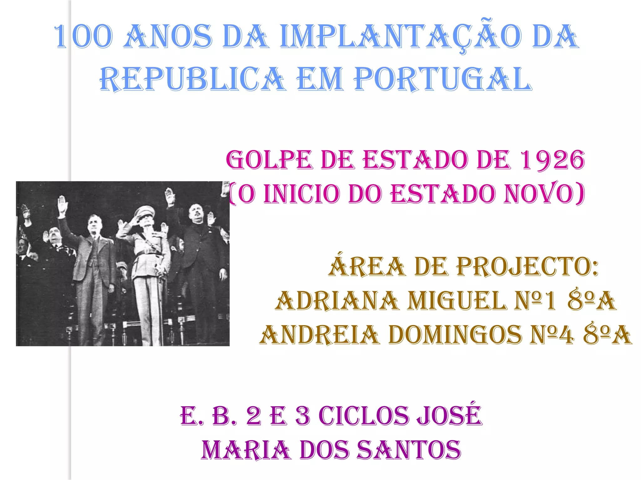 O documento descreve o golpe de Estado de 28 de Maio de 1926 em Portugal que deu início ao Estado Novo. O golpe foi liderado pelo general Gomes da Costa e por uma Junta de Salvação Pública em Lisboa. Após resistência inicial fraca, o governo renunciou e Bernardino Machado convidou Mendes Cabeçadas a formar um novo governo, encerrando a fase militar do golpe.