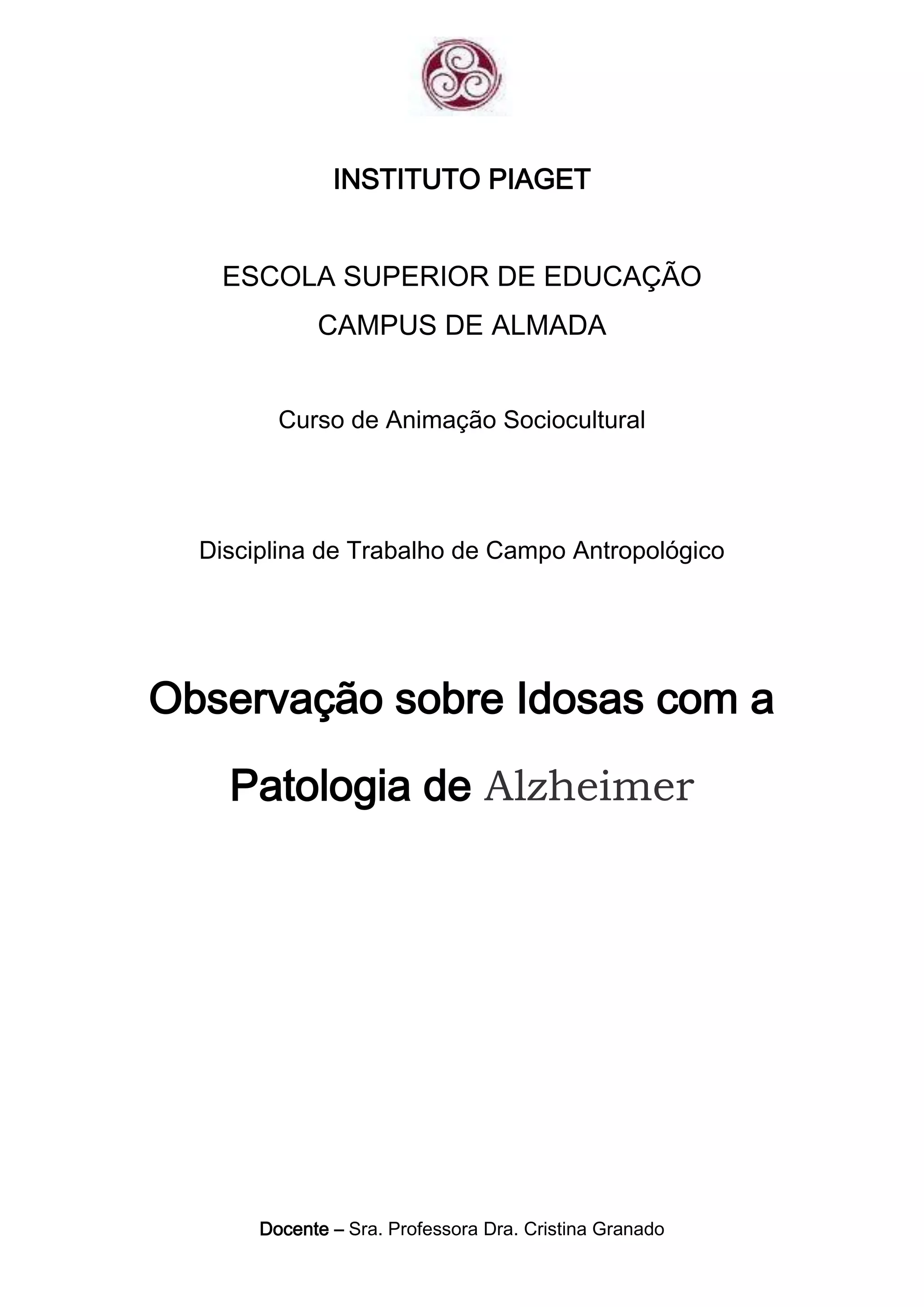 O documento descreve uma observação realizada numa casa de repouso para idosos com Alzheimer. Apresenta uma introdução sobre a doença de Alzheimer e seus sintomas. Também inclui entrevistas com profissionais da casa de repouso que fornecem informações sobre o diagnóstico e progressão da doença, bem como estratégias de cuidado para os pacientes.