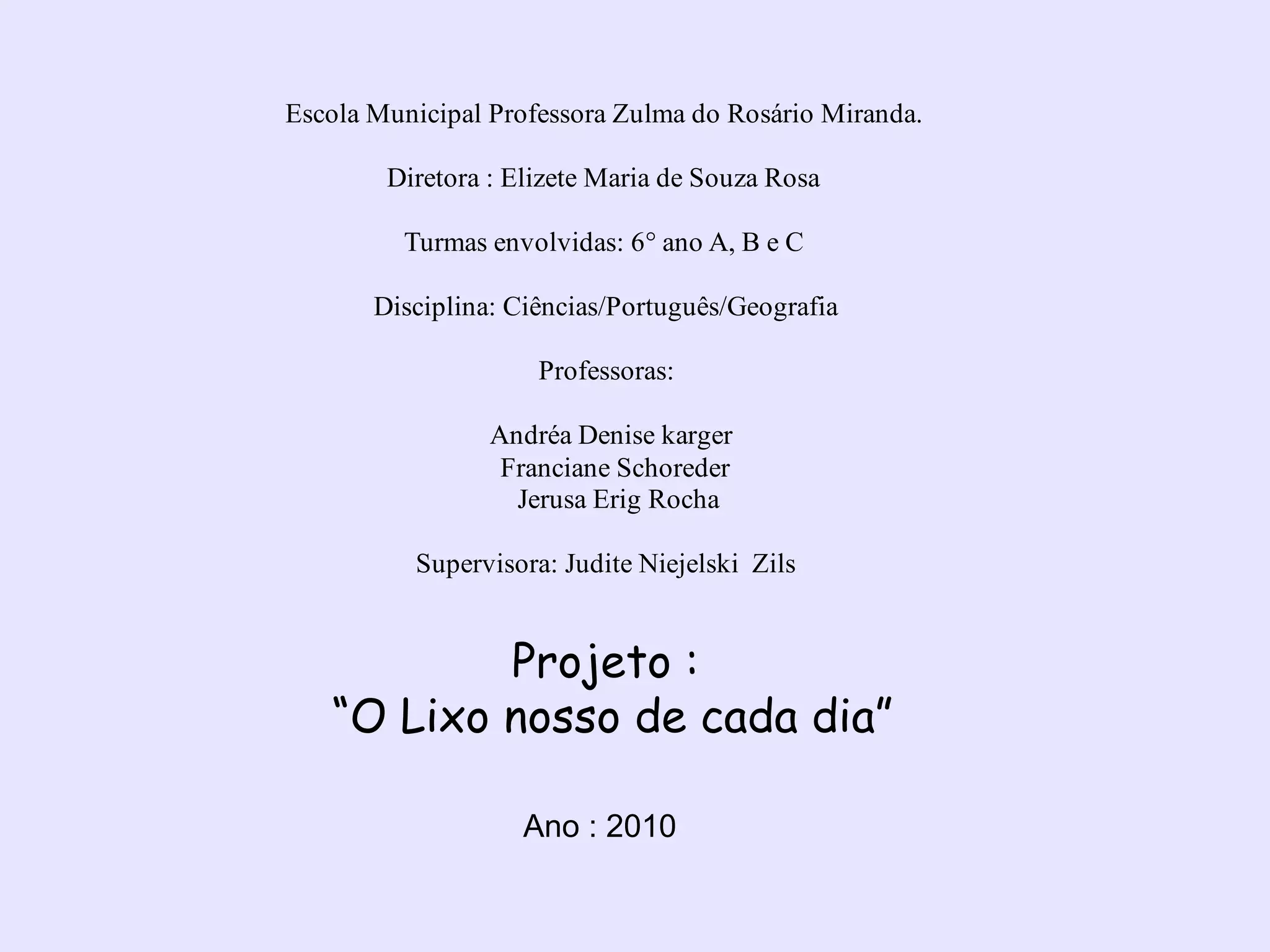 O projeto 'O Lixo Nosso de Cada Dia', de 2010, visa desenvolver atividades sobre coleta seletiva e reutilização de materiais para reduzir a quantidade de lixo nos aterros sanitaristas. Ele incentiva o consumo consciente e a mudança de atitudes em relação ao ambiente, utilizando métodos como elaboração de mapas conceituais e histórias em quadrinhos. As atividades incluem palestras e visitas a aterros sanitários para promover a conscientização entre os alunos do 6º ano.