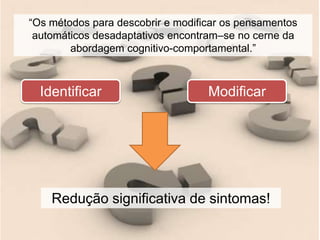 O documento descreve várias técnicas utilizadas na terapia cognitivo-comportamental para identificar e modificar pensamentos automáticos desadaptativos, incluindo a descoberta guiada de pensamentos, registro de pensamentos, geração de alternativas racionais e exercícios como ensaios cognitivos.