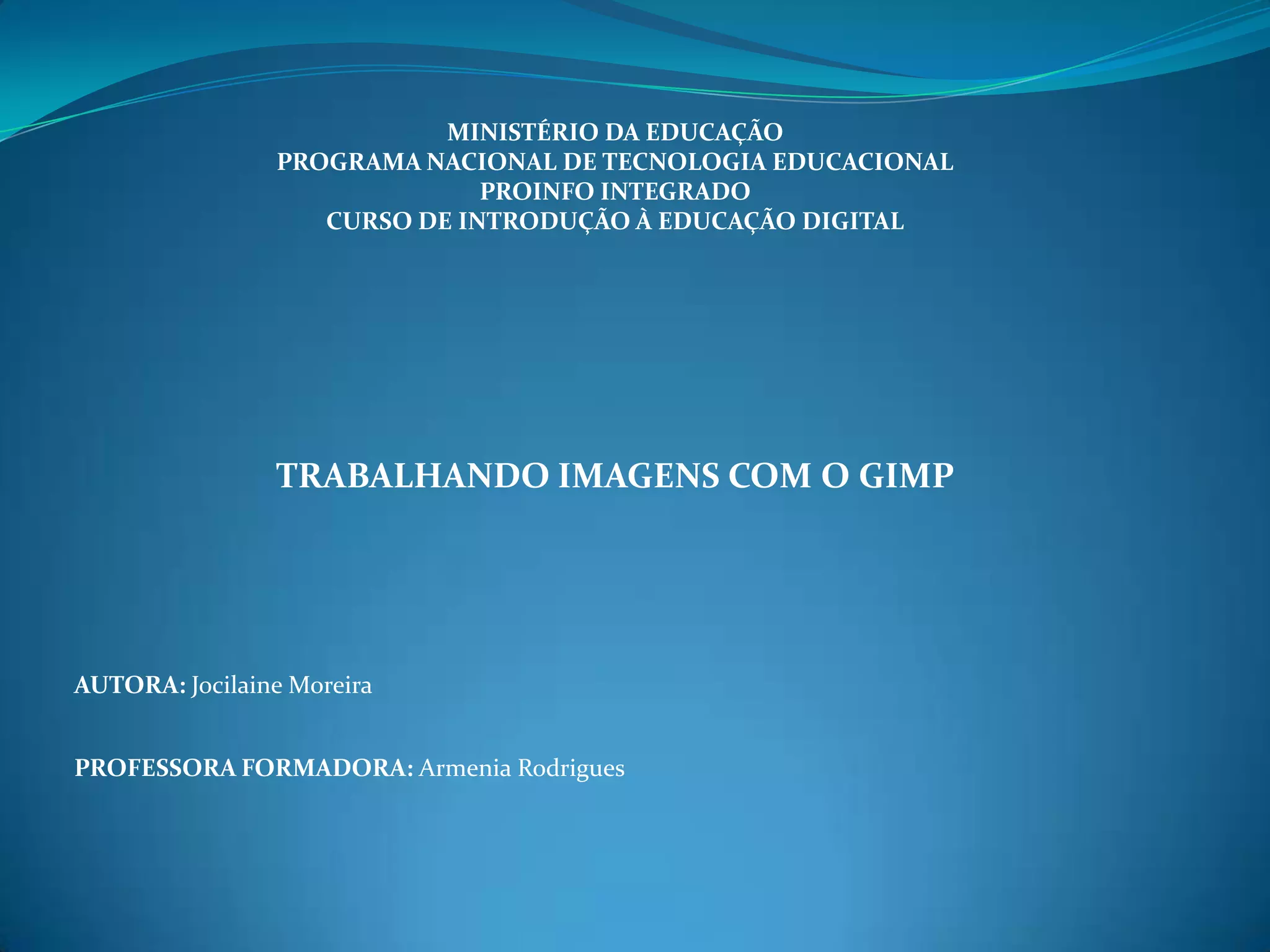 Este documento apresenta o software livre GIMP, um programa de edição de imagens similar ao Photoshop. Ele descreve como o GIMP pode ser usado em atividades pedagógicas para desenvolver a criatividade e coordenação motora de estudantes, por exemplo na criação de cartazes, folders e histórias em quadrinhos. O documento também fornece exemplos de como aplicar efeitos visuais com o GIMP e lista referências sobre o programa.