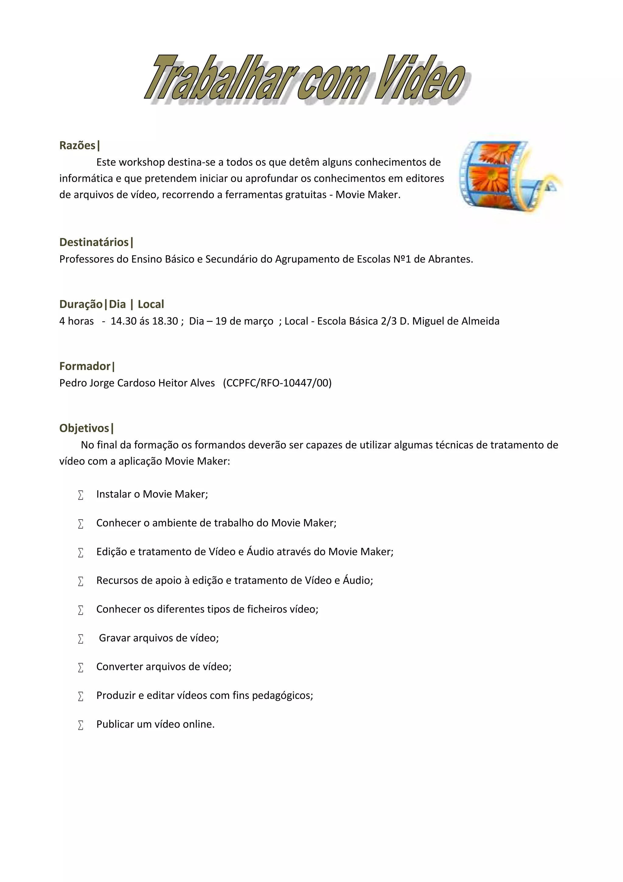 Este workshop de 4 horas ensinará professores a usar o Movie Maker para editar vídeos de forma gratuita. O workshop irá ensinar como instalar e usar as ferramentas do Movie Maker para editar e tratar vídeos e áudios com fins pedagógicos e como publicar os vídeos online. O workshop será conduzido ativamente com demonstrações práticas.