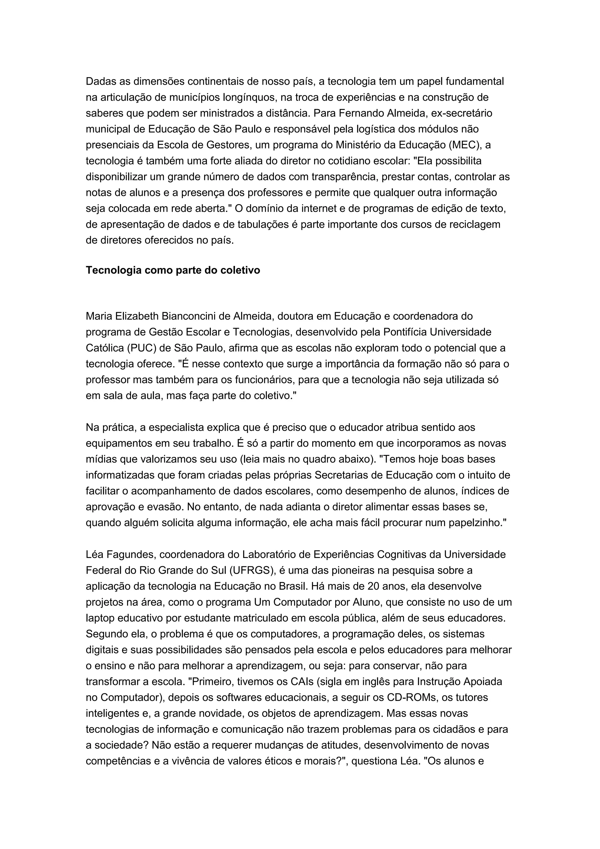 O documento discute o uso da tecnologia na educação brasileira. Aponta que as escolas não exploram todo o potencial da tecnologia e que é importante capacitar educadores e gestores para utilizá-la de forma participativa no processo de aprendizagem. Também destaca desafios como a necessidade de mudança de atitudes e a incorporação adequada da tecnologia nas práticas pedagógicas.