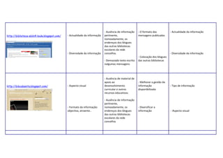 O documento analisa vários blogues de bibliotecas escolares, identificando para cada um dois pontos fortes e dois pontos fracos, bem como dois aspectos a melhorar a curto prazo e dois aspectos a manter. De modo geral, os blogues apresentam boa estrutura e aspecto visual, mas carecem de mais recursos educativos e informação sobre atividades desenvolvidas.