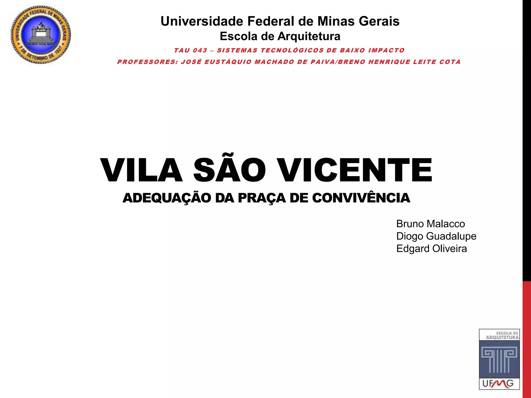 O documento apresenta uma proposta de adequação da praça de convivência da Vila São Vicente em Minas Gerais, Brasil. O projeto sugere a utilização de piso cimentado para a área multiuso devido à eficiência e baixo custo de manutenção. O mobiliário urbano proposto é flexível e de fácil remoção para permitir diferentes usos do espaço. Referências conceituais incluem projetos de praças e espaços públicos no Brasil e exterior.