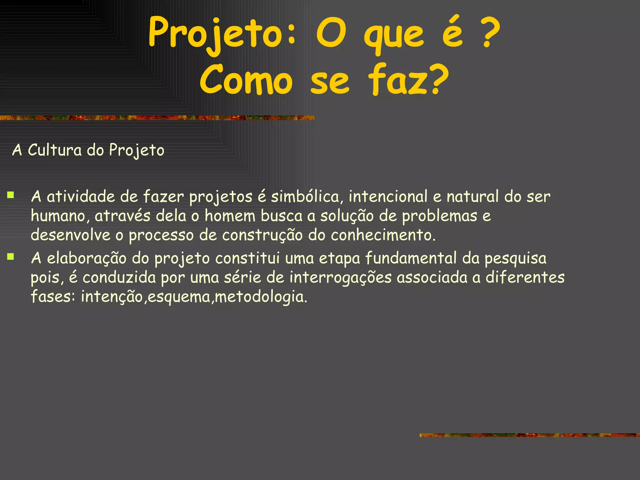 O documento discute o conceito de projetos e aprendizagem por projetos, destacando que projetos permitem que os alunos construam conhecimento através da interação e resolução de problemas. Também aborda como os professores podem estimular a curiosidade dos alunos e permitir que eles dirijam seu próprio processo de aprendizagem através de perguntas e problemas significativos.