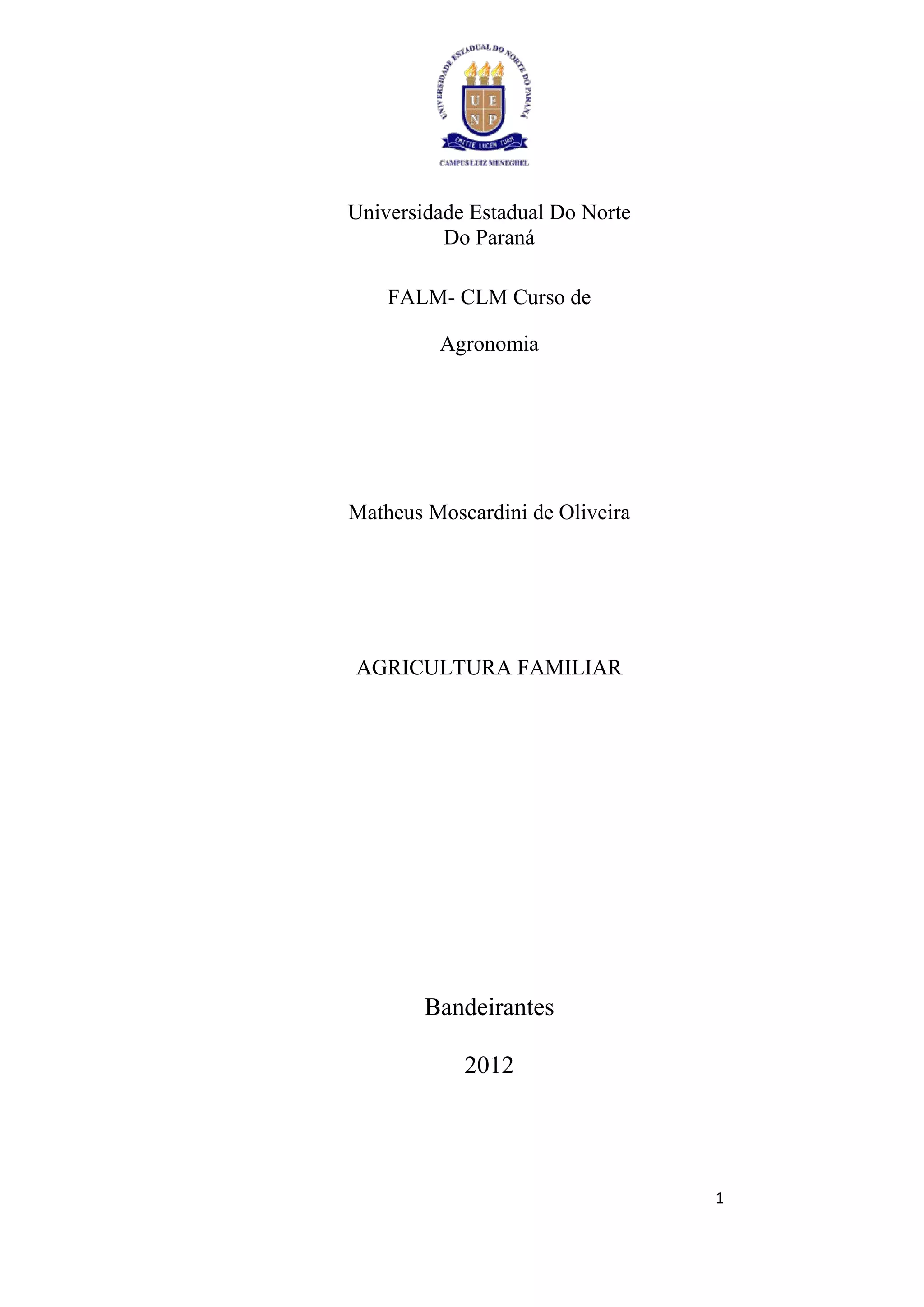 Este documento é um trabalho acadêmico sobre agricultura familiar no norte do Paraná. Ele contém uma introdução sobre a relação entre terra, trabalho e família na agricultura familiar e como esta produz cerca de 60% dos alimentos no Brasil. Também descreve os principais aspectos da agricultura familiar, como sua sustentabilidade econômica, social e ambiental, e conclui que esta é uma alternativa eficiente para o futuro devido aos seus benefícios.