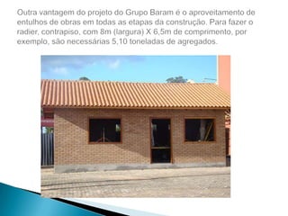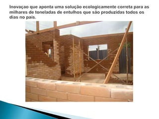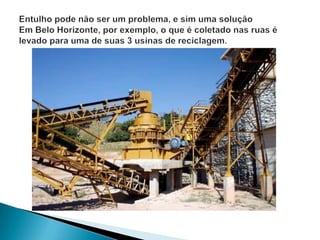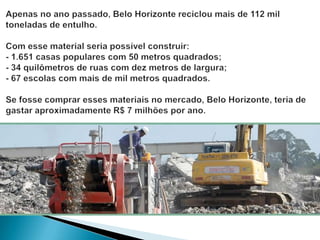 O documento discute os problemas causados pelo lixo gerado na construção civil e as vantagens da reciclagem desse lixo. A construção civil gera cerca de 70% do lixo das cidades e seu descarte incorreto causa problemas ambientais e eleva custos. A reciclagem desse lixo pode reduzir custos, gerar novos materiais e reduzir o volume de aterros sanitários. No entanto, ainda há poucos incentivos e investimentos nessa área no Brasil.