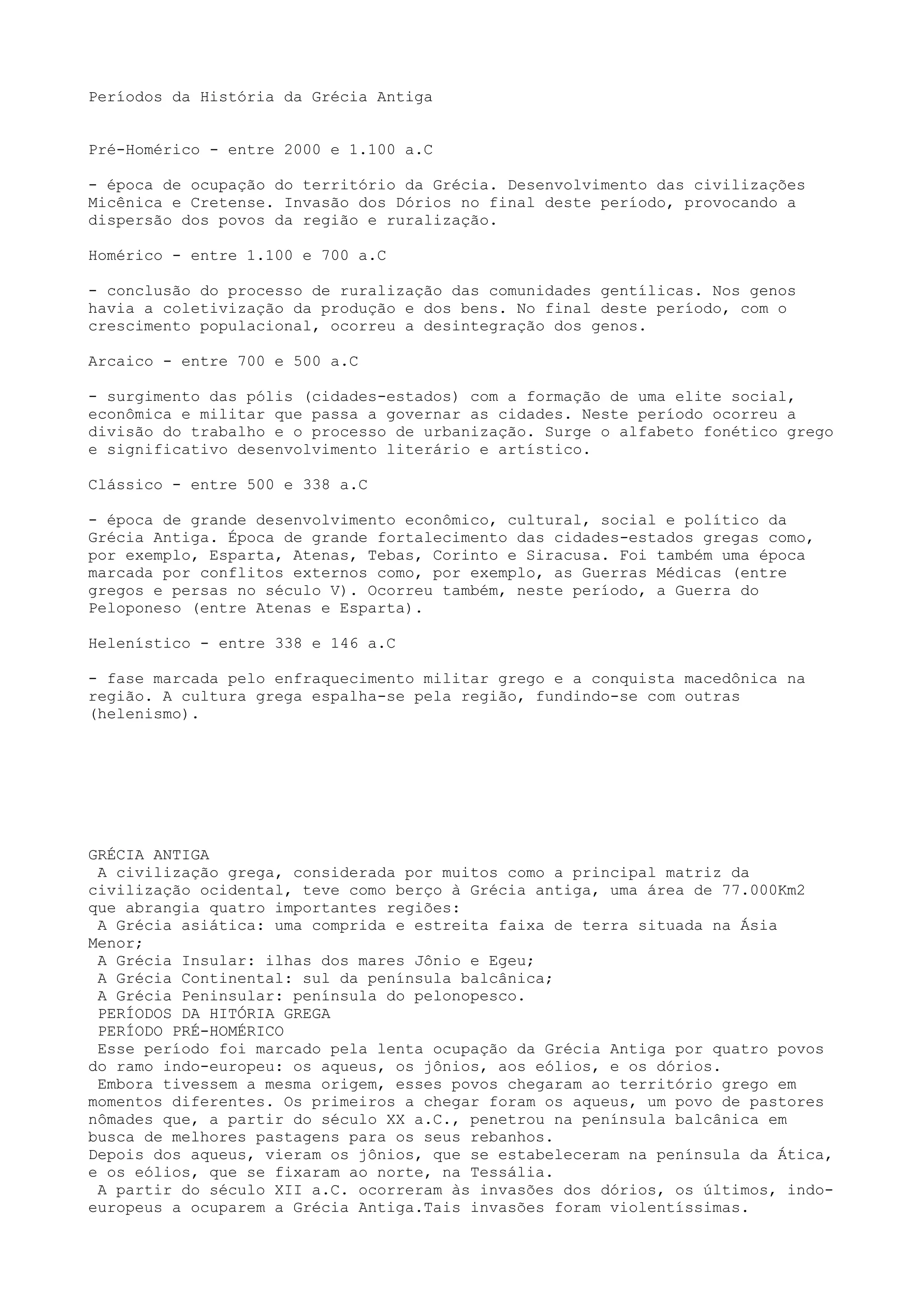 Este documento descreve os principais períodos da história da Grécia Antiga: Pré-Homérico, Homérico, Arcaico, Clássico e Helenístico. Cada período teve características culturais, sociais e políticas únicas, desde a ocupação inicial do território grego até a conquista macedônica e a disseminação da cultura helenística.