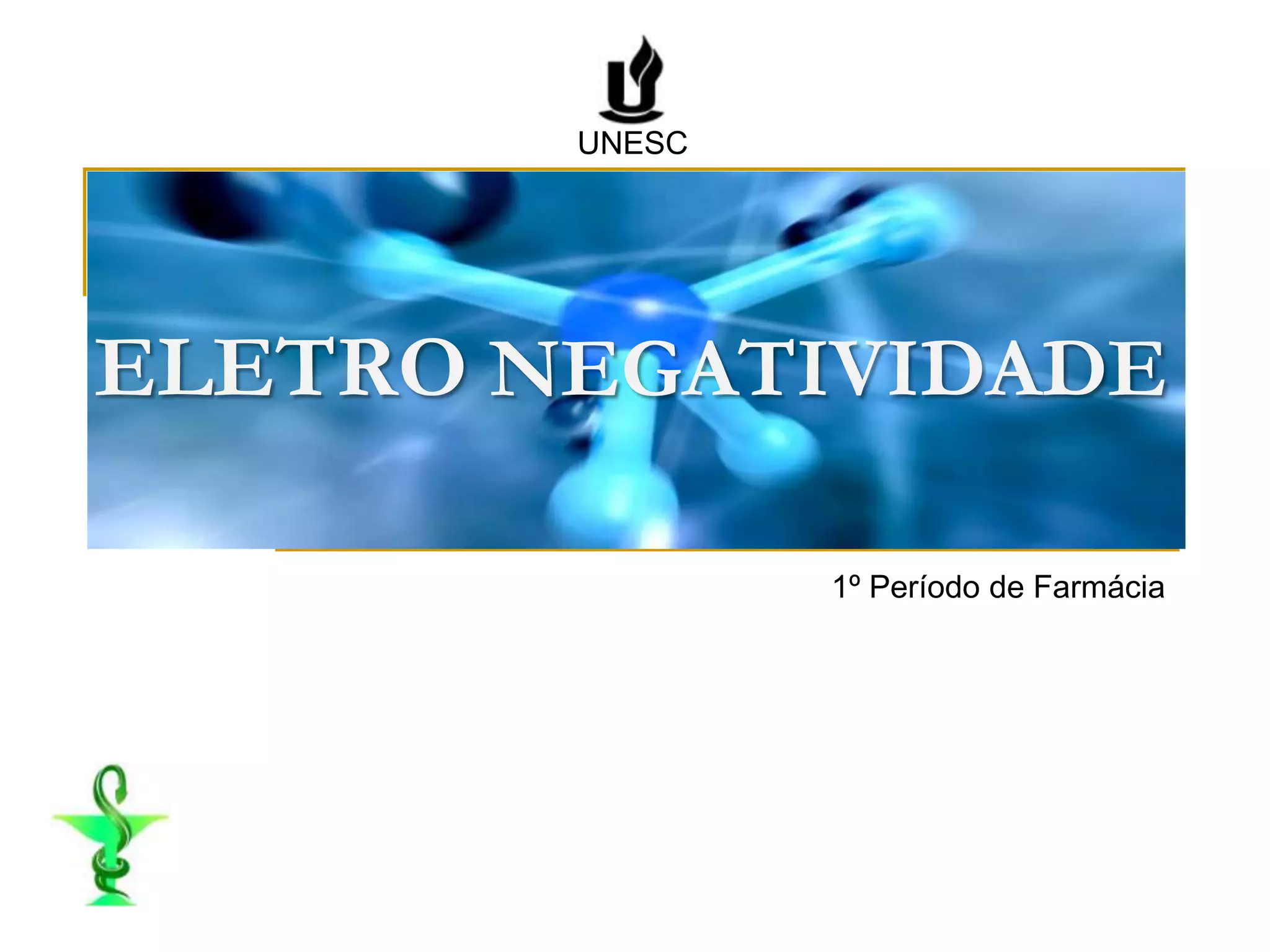 O documento discute as propriedades periódicas dos elementos, incluindo eletronegatividade. Explica que eletronegatividade é a capacidade de um átomo atrair elétrons em uma ligação química e varia periodicamente na tabela periódica, com elementos mais à direita e acima sendo mais eletronegativos. Também discute como eletronegatividade afeta os tipos de ligação, com diferenças grandes de eletronegatividade resultando em ligações iônicas e diferenças pequenas resultando em liga