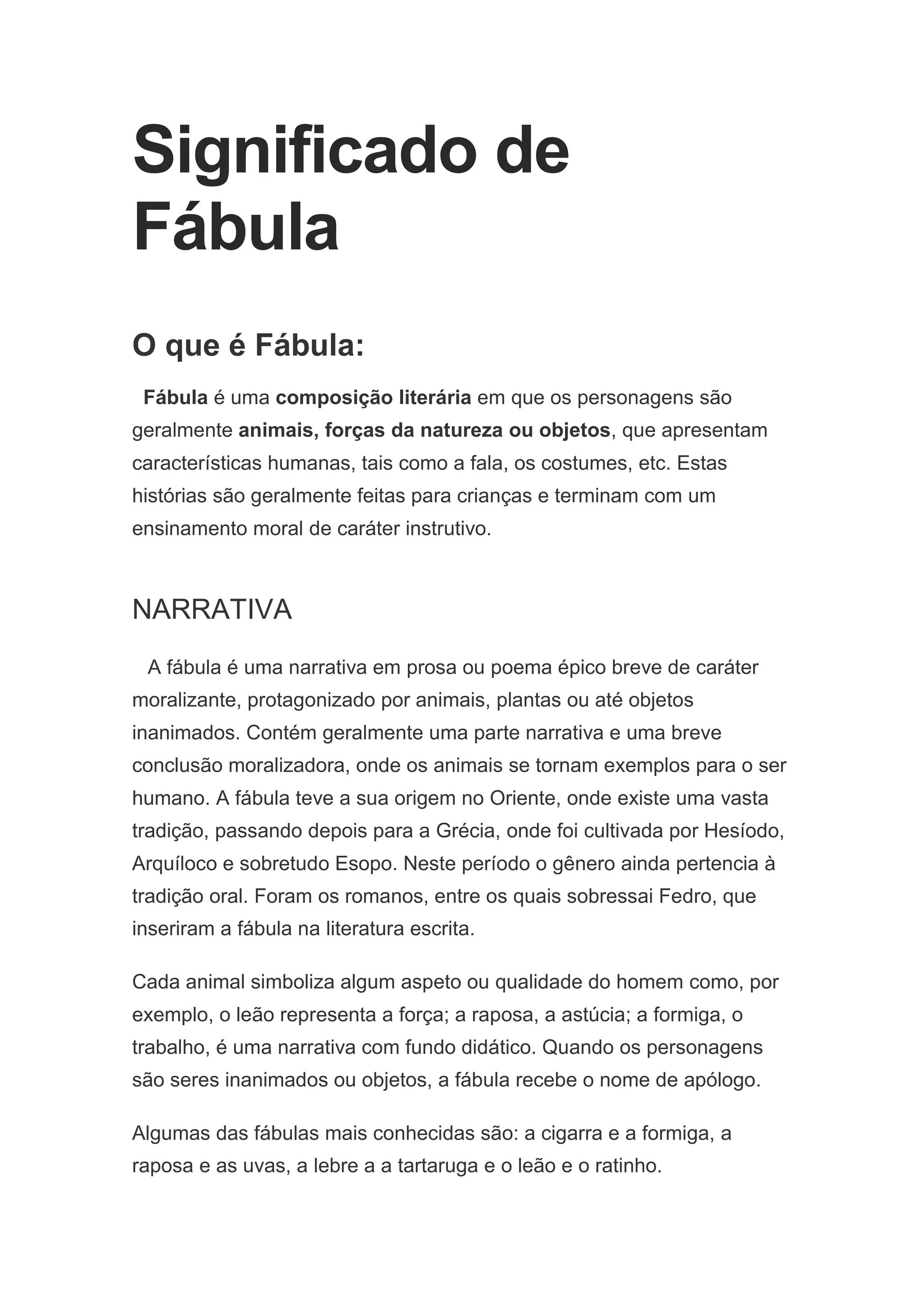 A fábula é uma narrativa curta com personagens geralmente animais que apresentam características humanas e ensinamentos morais. As fábulas mais famosas foram escritas por Esopo, Fedro e La Fontaine e usam alegorias para criticar a sociedade e ensinar lições.