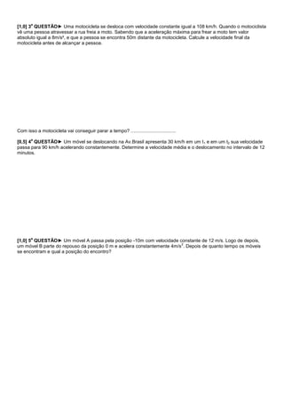 I) As velocidades de A e B são respectivamente VA = 5 m/s e VB = 10t m/s. A aceleração de A é 0 m/s2 e a de B é 10 m/s2.