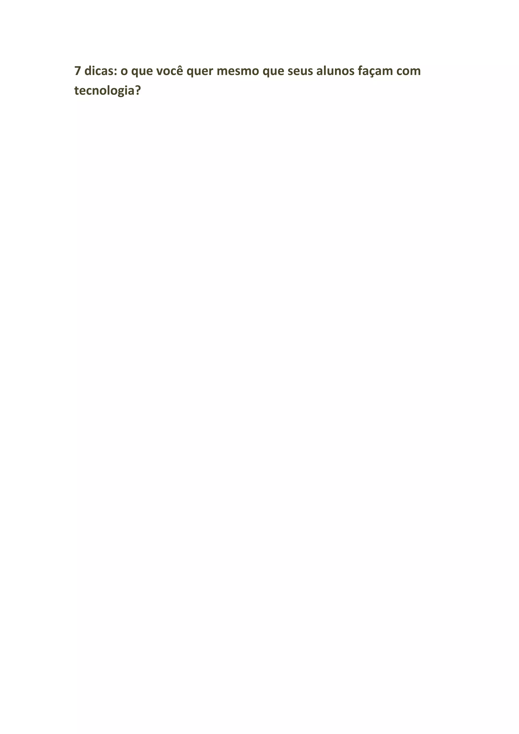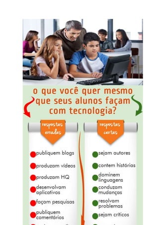 O documento fornece dicas sobre como estimular o uso seguro e educacional da internet e da tecnologia por estudantes. Sugere que as crianças e jovens hoje usam a internet de forma multitarefa para estudar e que os pais e professores precisam entender melhor como eles se relacionam com a tecnologia.