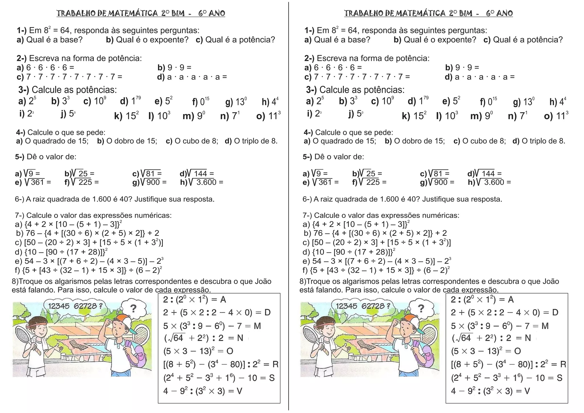O documento apresenta um teste de matemática com várias questões para alunos do 6o ao 9o ano. As questões incluem cálculos de potenciação, raiz quadrada, áreas de figuras geométricas e expressões algébricas. O teste é dividido por ano de escolaridade, com cada parte contendo entre 5 e 14 questões.