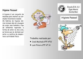 O documento discute a importância da higiene pessoal para a saúde. Ele lista hábitos de higiene diários como tomar banho, lavar as mãos, cuidar dos dentes, e ter uma alimentação equilibrada. Também destaca consequências de não ter boa higiene como mau cheiro, dentes podres e mau hálito. Finalmente, enfatiza a importância de manter o uniforme escolar e calçados limpos.