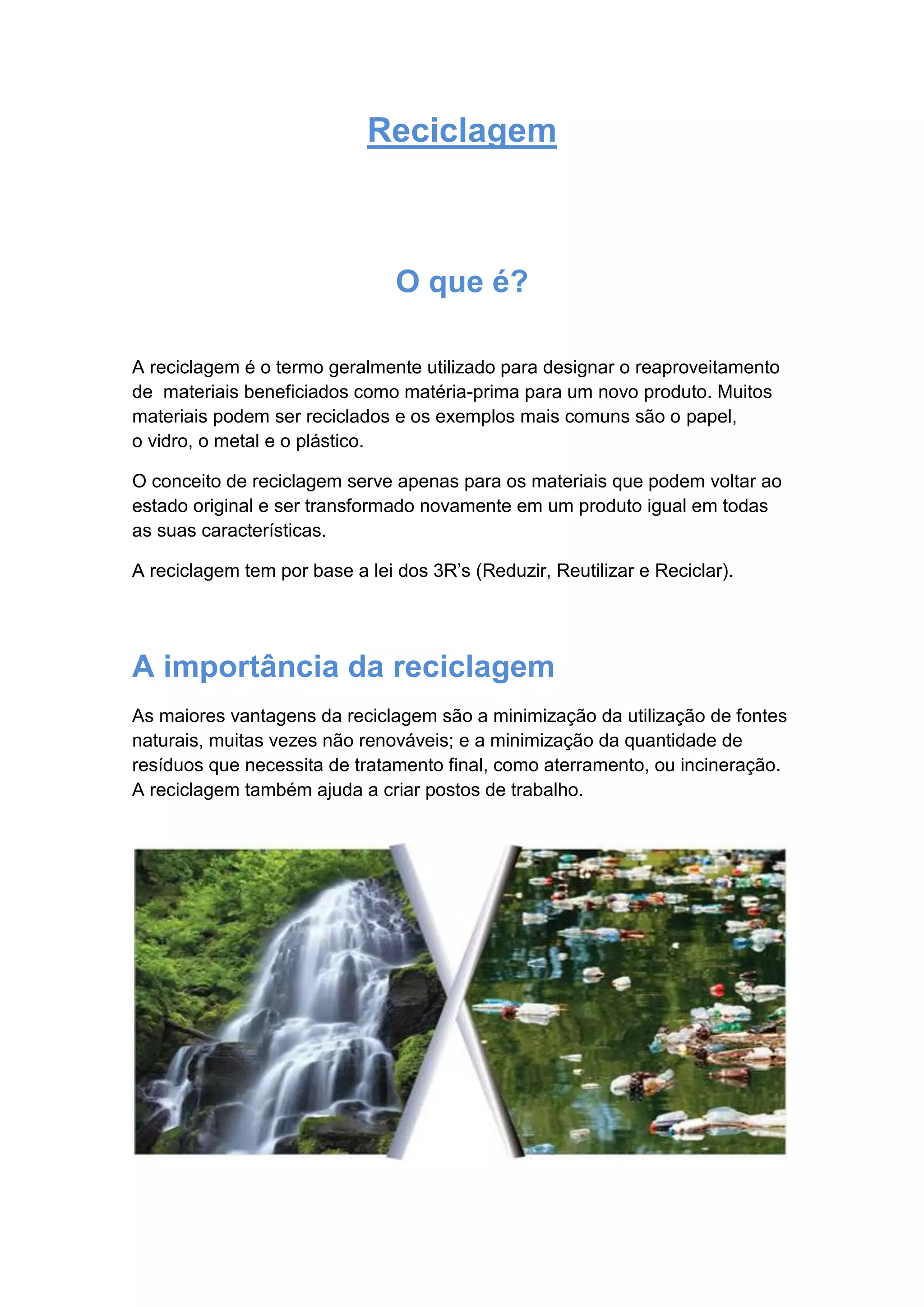 A reciclagem envolve o reaproveitamento de materiais como matéria-prima para novos produtos, como papel, vidro, metal e plástico. Isso ajuda a minimizar o uso de recursos naturais e a quantidade de resíduos, além de criar empregos. Os países que mais reciclam são Japão, EUA, Suécia, Dinamarca e Noruega. A reciclagem é essencial para um futuro sustentável com recursos disponíveis.