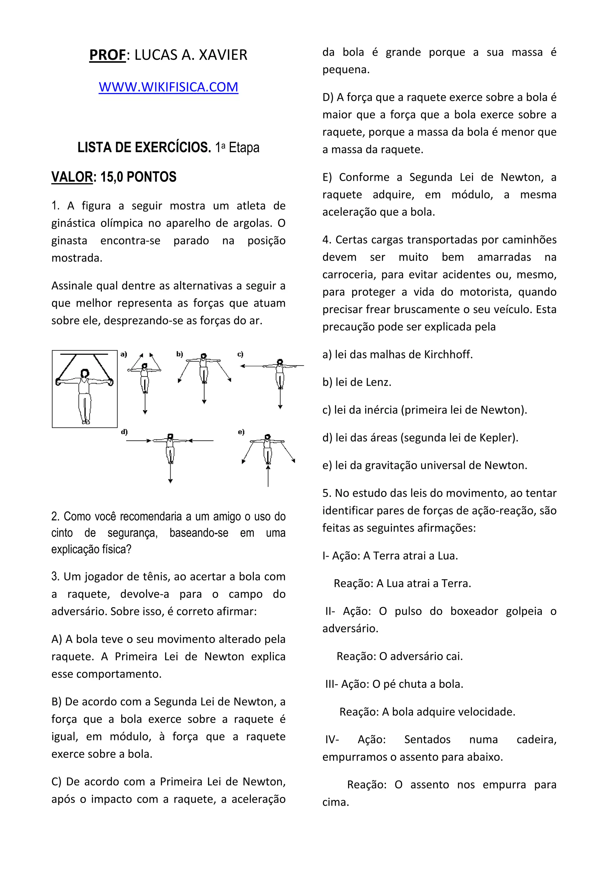 Este documento apresenta um conjunto de exercícios e seminários sobre mecânica newtoniana e o sistema solar para uma primeira etapa avaliativa. Inclui 15 questões objetivas sobre forças, movimento e leis de Newton, além de instruções para a realização de seminários em grupo sobre diferentes planetas e corpos do sistema solar.