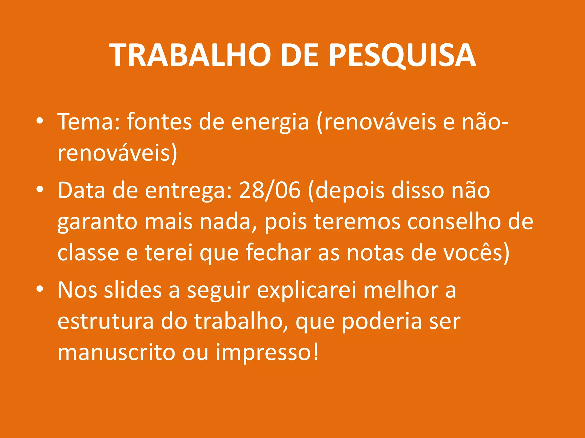 O documento fornece instruções para a elaboração de um trabalho de pesquisa sobre fontes de energia renováveis e não renováveis. Deve conter capa, introdução, desenvolvimento, conclusão e bibliografia. A data de entrega é 28/06.