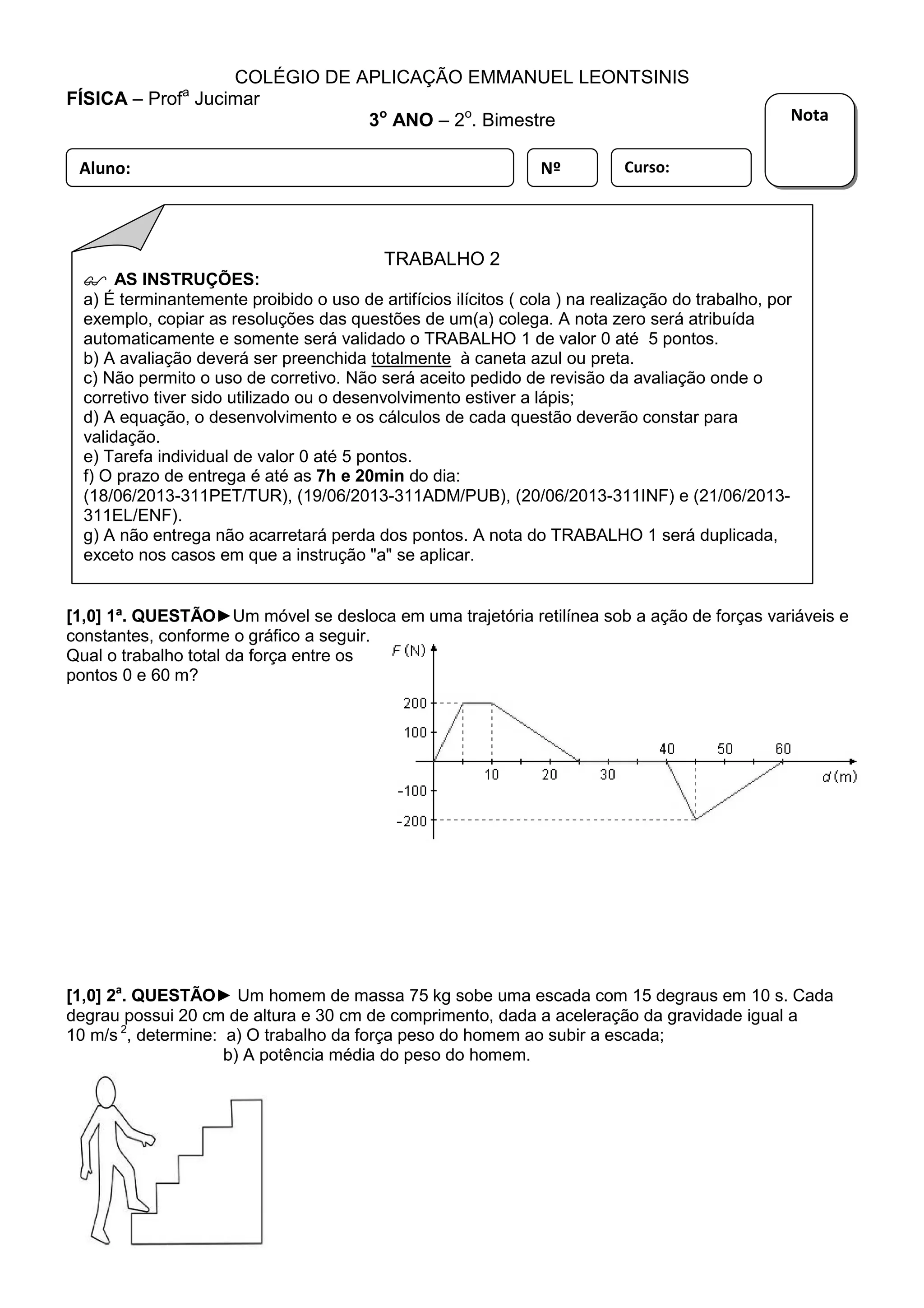 Este documento contém 5 questões de física sobre trabalho, energia e movimento. A primeira pergunta calcula o trabalho total de uma força variável entre dois pontos de uma trajetória retilínea. A segunda calcula o trabalho da força peso de um homem subindo uma escada e sua potência média. A terceira calcula o trabalho realizado por uma mola ao se distender completamente empurrando um bloco.