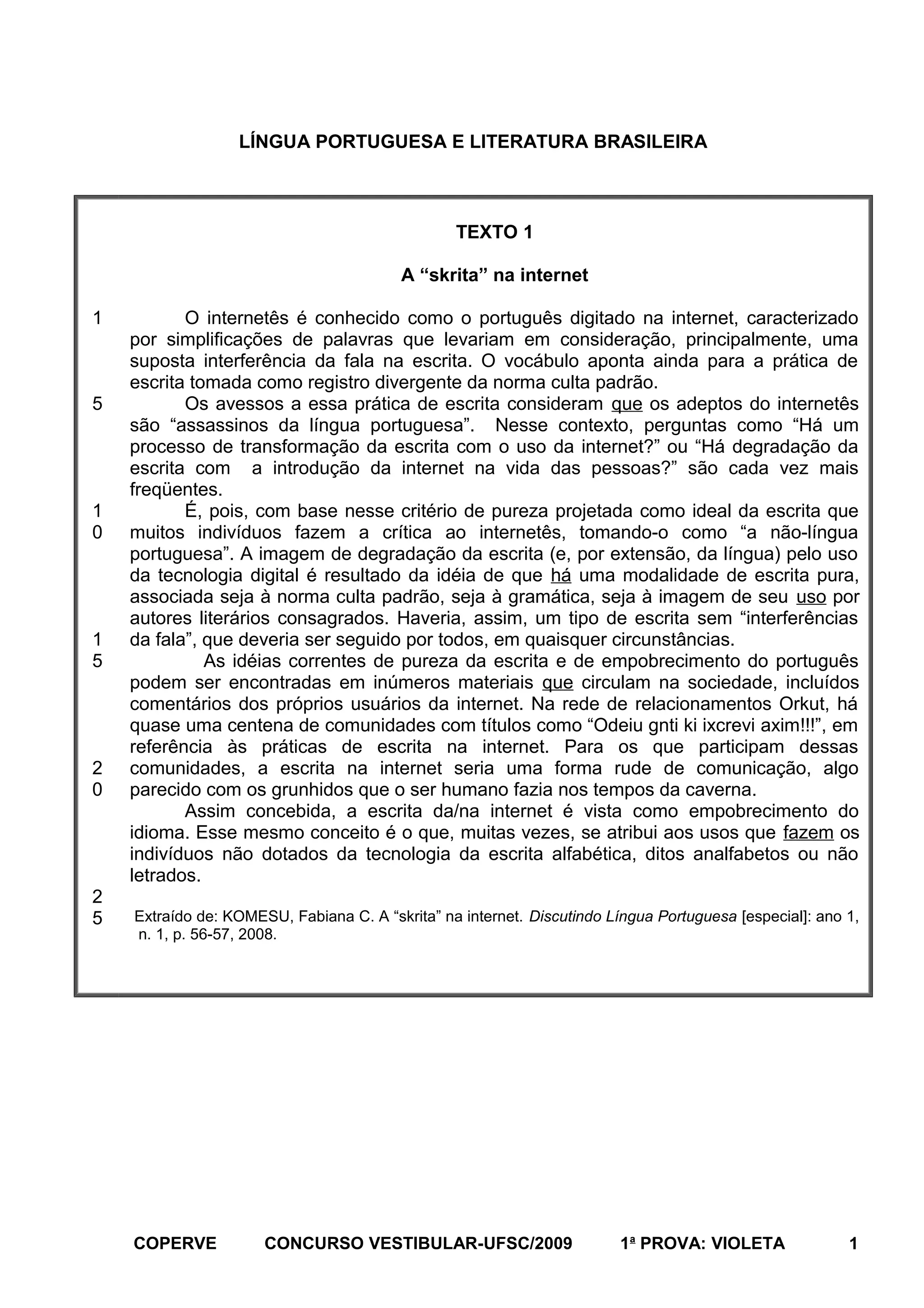 O texto aborda a prática do "internetês", caracterizada por simplificações na escrita influenciadas pela fala. Alguns criticam essa prática como degradação da língua, enquanto outros a veem como variante legítima. O texto discute a ideia de pureza da escrita versus a natural evolução proporcionada pelo uso da tecnologia.