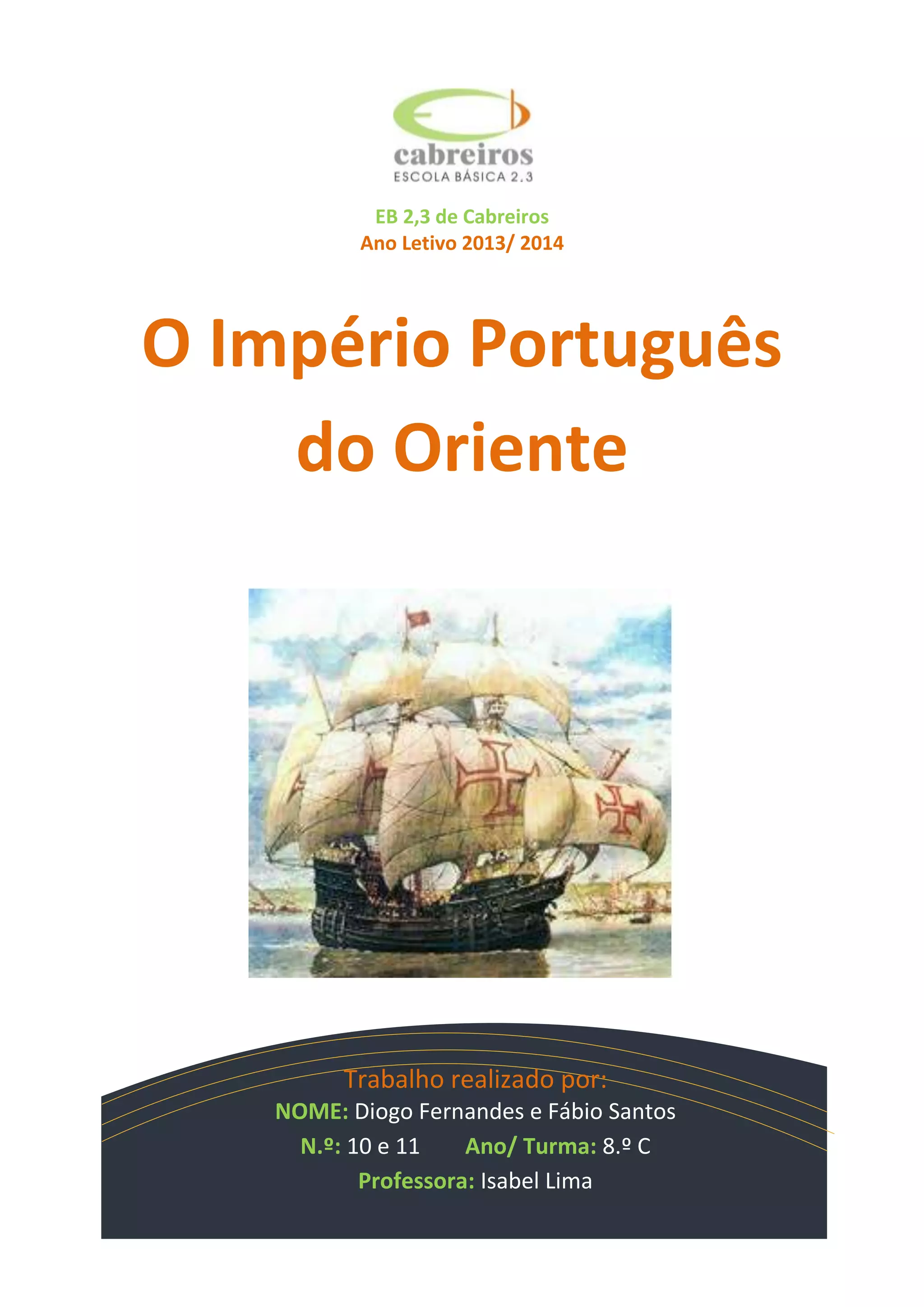 Este documento é um relatório escolar sobre o Império Português do Oriente escrito por Diogo Fernandes e Fábio Santos para a professora Isabel Lima da 8a classe da Escola EB 2,3 de Cabreiros no ano letivo de 2013/2014. O relatório inclui uma introdução explicando que o trabalho foi feito em grupo em vez de um teste sobre o assunto que estavam estudando.