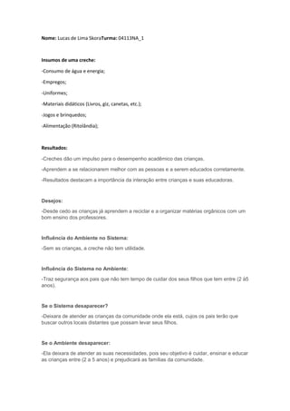 O documento descreve os insumos, resultados, desejos, influências e consequências de uma creche. Ele lista os materiais e suprimentos necessários, como água, energia, uniformes e alimentos. Também explica como as creches ajudam no desenvolvimento das crianças e trazem segurança para os pais que precisam trabalhar.