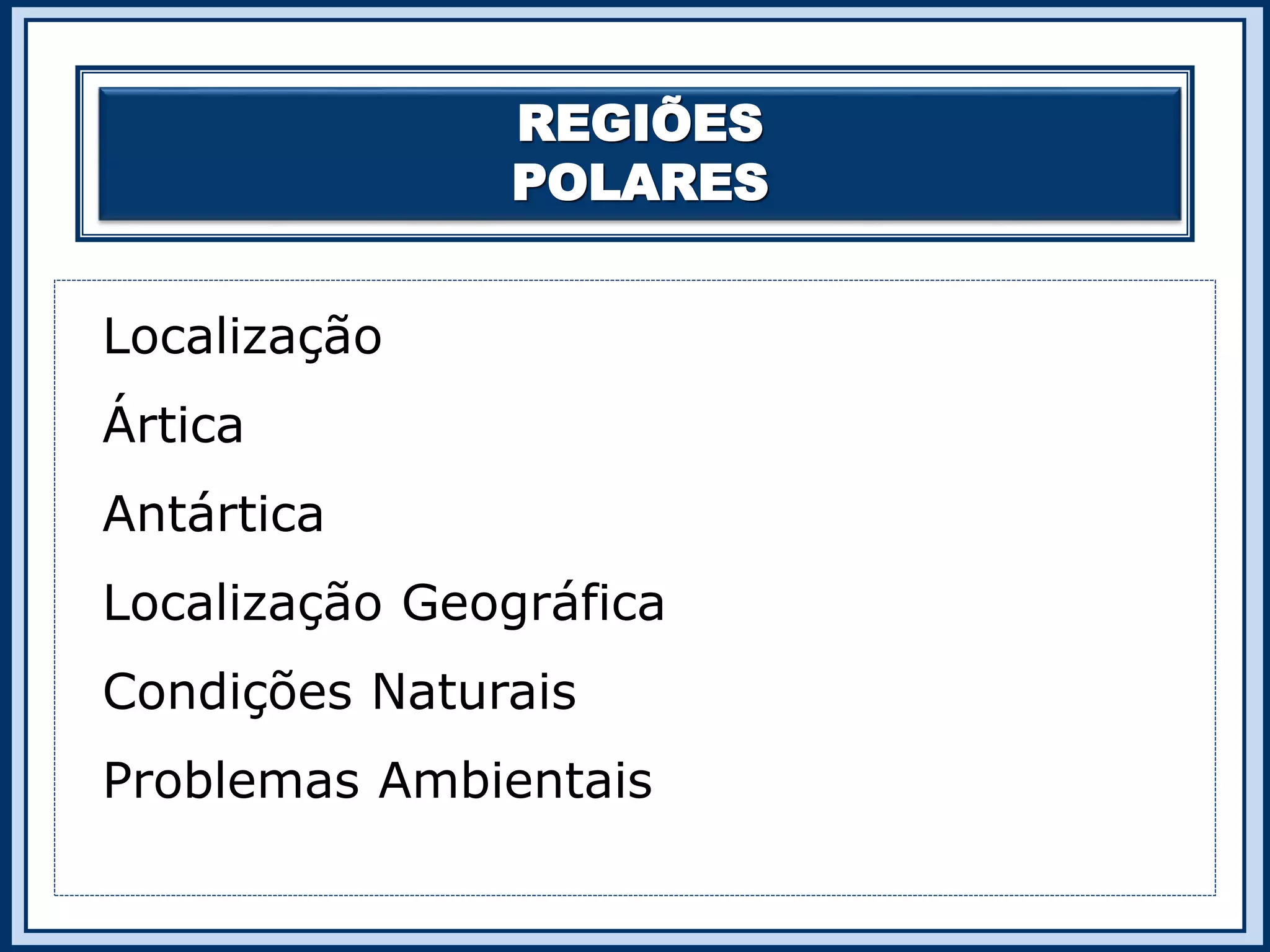 O documento descreve as regiões polares do Ártico e da Antártica, discutindo sua localização geográfica, condições naturais extremas de frio, ventos fortes e variação na duração do dia e da noite. Também menciona problemas ambientais como o aquecimento global e derretimento dos glaciares, que podem elevar o nível do mar.