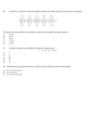 1) O documento contém um teste avaliativo com 8 questões para alunos do 1o ano. As questões incluem desafios matemáticos, séries lógicas, sucessões de palavras e determinação de padrões. 2) As questões abrangem tópicos como caminhos em pirâmides com soma igual a 60, continuação de séries como "B D G L Q", relações entre palavras como "AVÔ - TIO - SOGRO - FILHO - SOBRINHO" e determinação do próximo termo em sequências numéric
