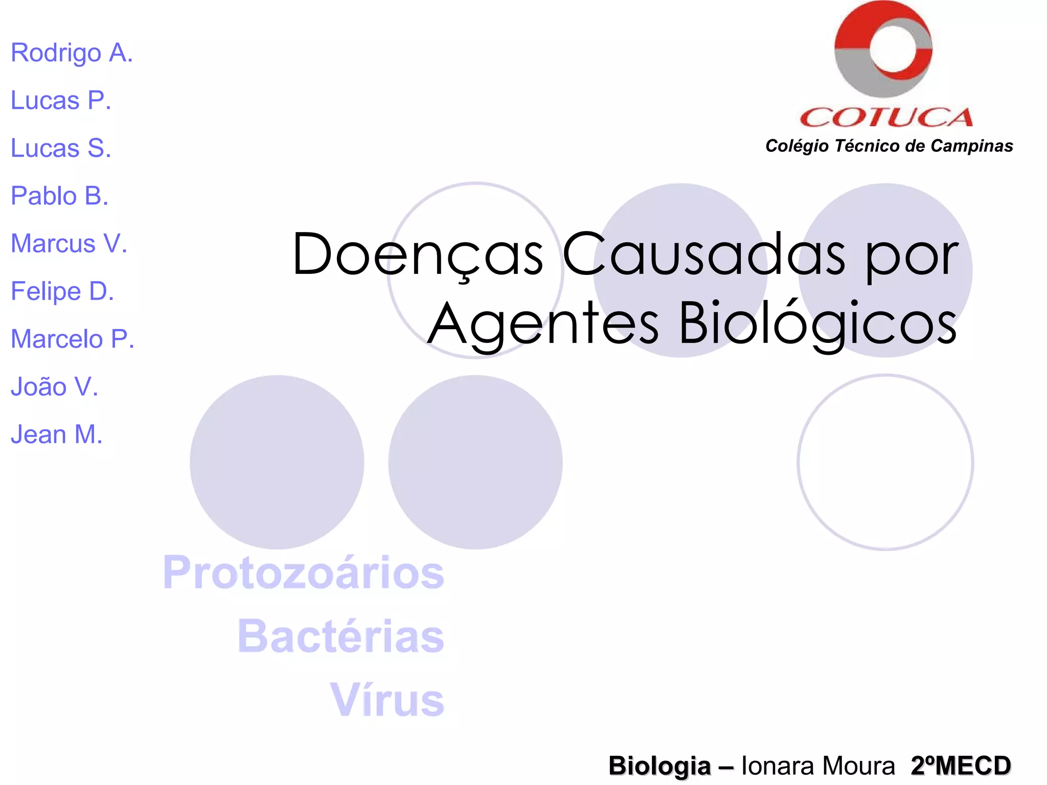 1. O documento descreve várias doenças causadas por agentes biológicos, incluindo a malária, tétano, cólera, giardíase, ebola e outras.