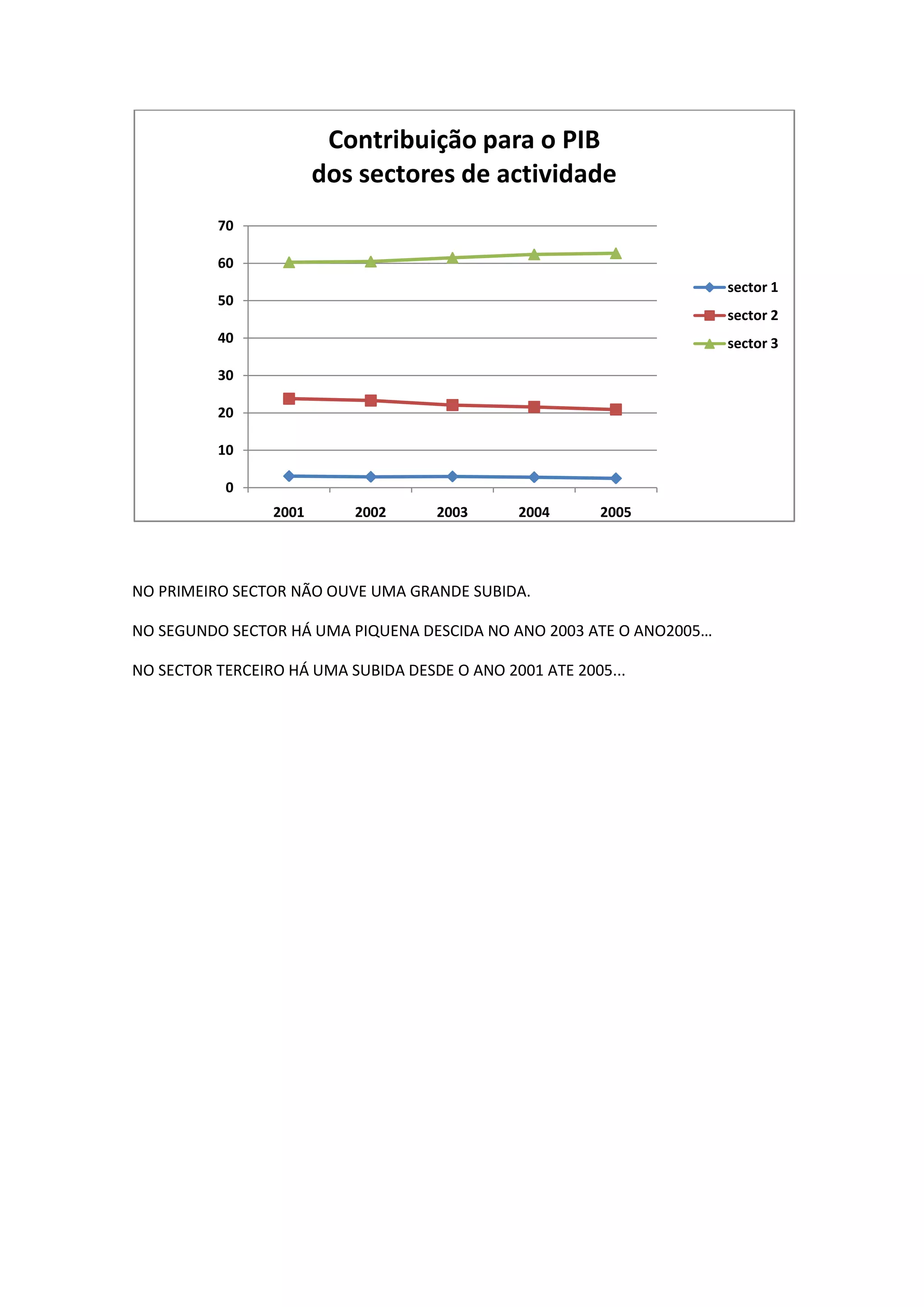 O gráfico mostra que no primeiro setor não houve grande variação entre 2001-2005. No segundo setor houve uma pequena queda de 2003-2005 e uma subida no terceiro setor de 2001-2005. Outro gráfico indica uma ligeira alta nos serviços e pequena queda no comércio de 2003-2005.