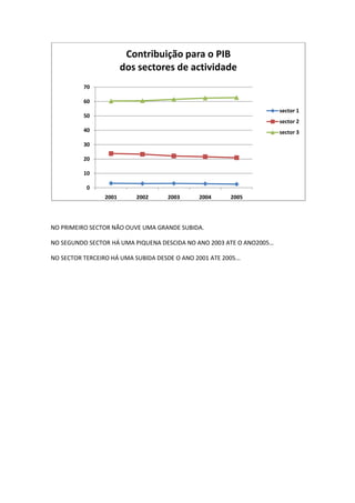 O gráfico mostra que no primeiro setor não houve grande variação entre 2001-2005. No segundo setor houve uma pequena queda de 2003-2005 e uma subida no terceiro setor de 2001-2005. Outro gráfico indica uma ligeira alta nos serviços e pequena queda no comércio de 2003-2005.