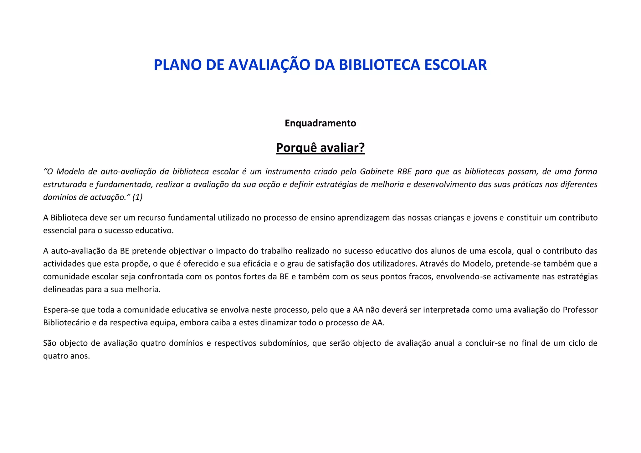 Este documento apresenta o plano de avaliação da biblioteca escolar com foco no domínio da leitura e literacia. O plano inclui um diagnóstico inicial identificando pontos fortes e a melhorar, como promover atividades de leitura em diferentes ambientes. O plano também define etapas como recolha de dados, análise e desenvolvimento de um plano de ação focado em melhorar as competências de leitura dos alunos e o impacto da biblioteca nessa área.
