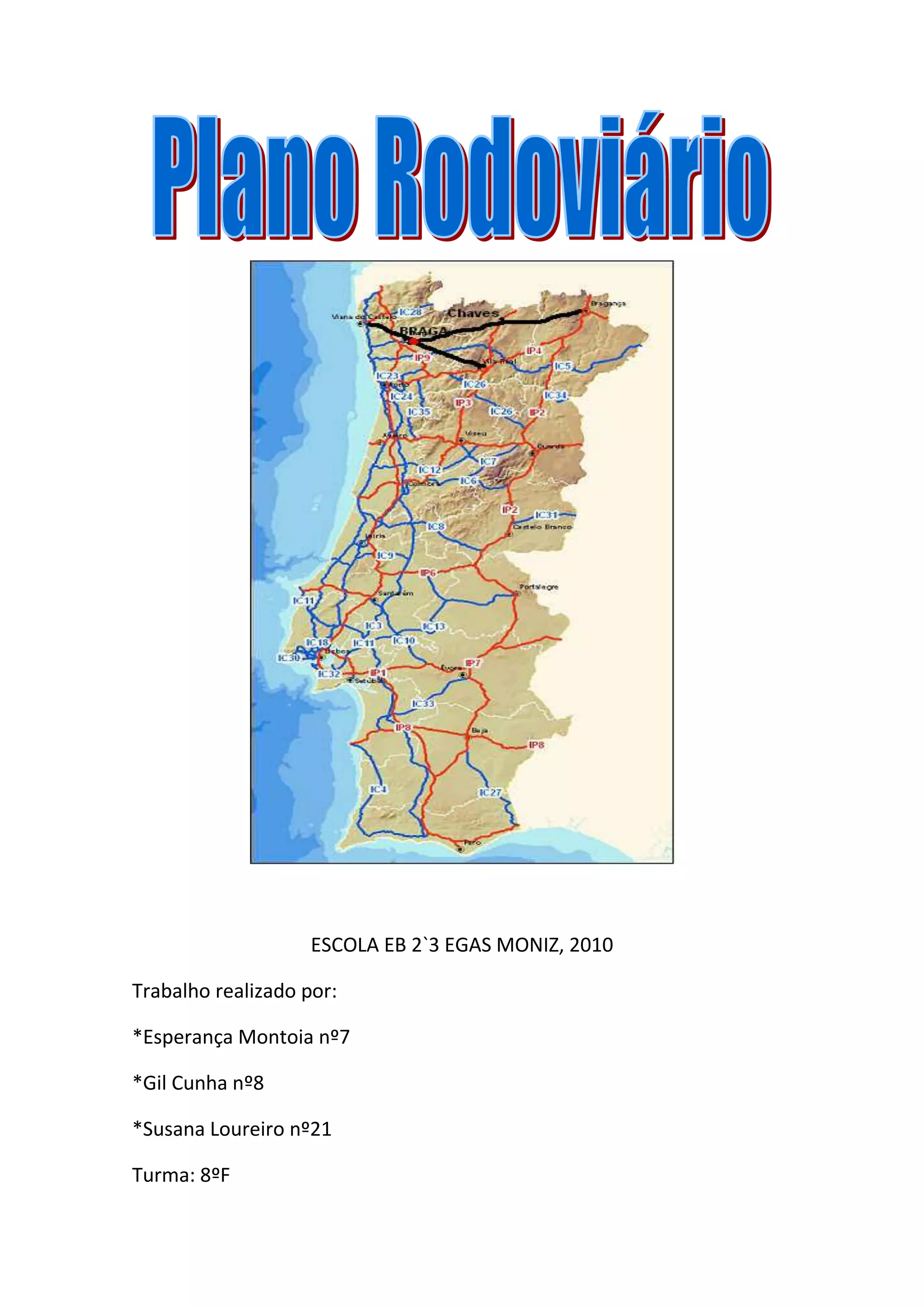 O trabalho realizado por três alunos da 8a classe da Escola EB 2`3 Egas Moniz em 2010 trata do Plano Nacional Rodoviário de Portugal, com o objetivo de conhecer as estradas do país e como elas conectam diferentes locais.
