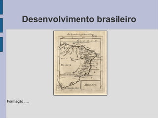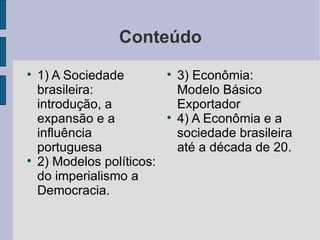 O documento discute a formação da sociedade brasileira, seus modelos políticos e desenvolvimento econômico ao longo dos séculos. Ele aborda a influência portuguesa na sociedade colonial brasileira, os principais modelos políticos desde o imperialismo até a democracia, e a economia de exportação agrícola que prevaleceu até a década de 1920 e sua crise resultante da quebra da Bolsa de Nova York.