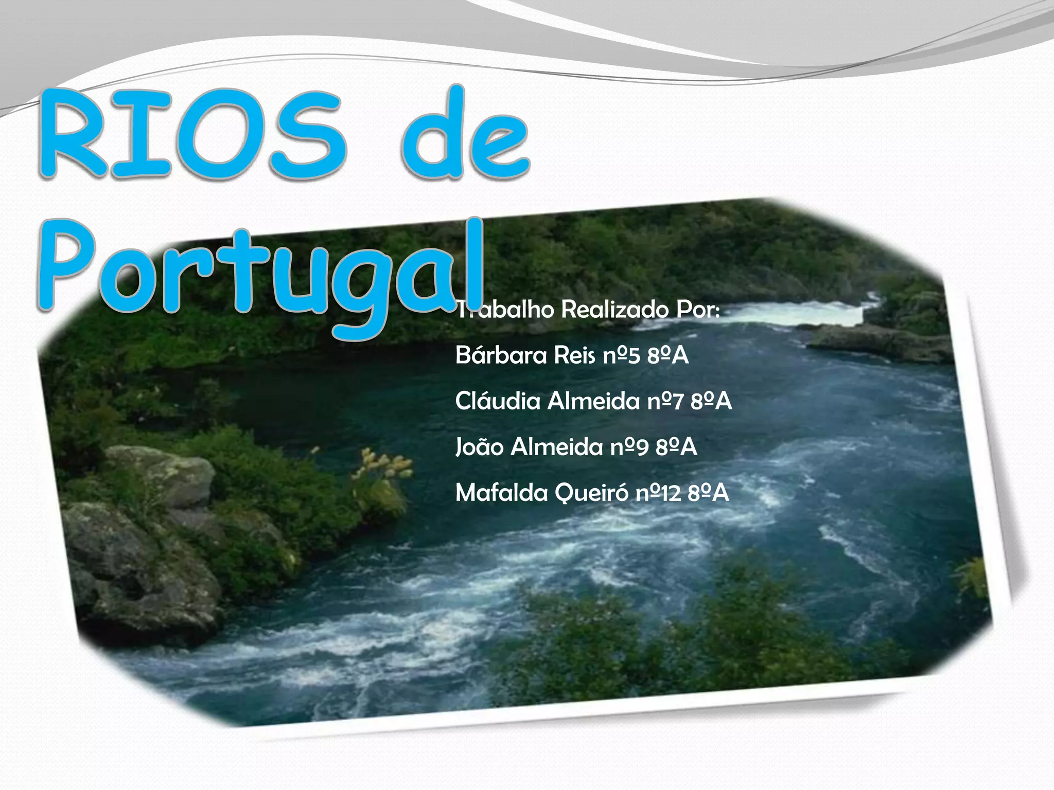 Este documento descreve 5 rios portugueses: o Douro, Minho, Tejo, Sado e Guadiana. O Douro é o segundo rio mais extenso da Península Ibérica e desagua no Porto. O Minho serve como fronteira entre Portugal e Espanha. O Tejo é o rio mais longo da Península Ibérica. O Sado flui de sul para norte, e o Guadiana é um rio internacional entre Portugal e Espanha.