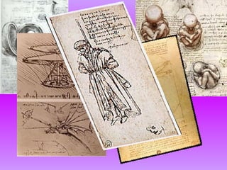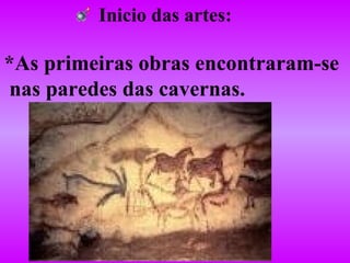 O documento resume a evolução histórica das artes visuais, começando pelas pinturas rupestres nas cavernas. Detalha as características da arte mesopotâmica, egípcia e grega antiga, focando em temas religiosos e deuses. Apresenta os principais estilos artísticos ao longo da história e destaca Leonardo da Vinci como um grande expoente das artes visuais durante o Renascimento. Resume obras importantes de Da Vinci como a Mona Lisa e A Última Ceia.