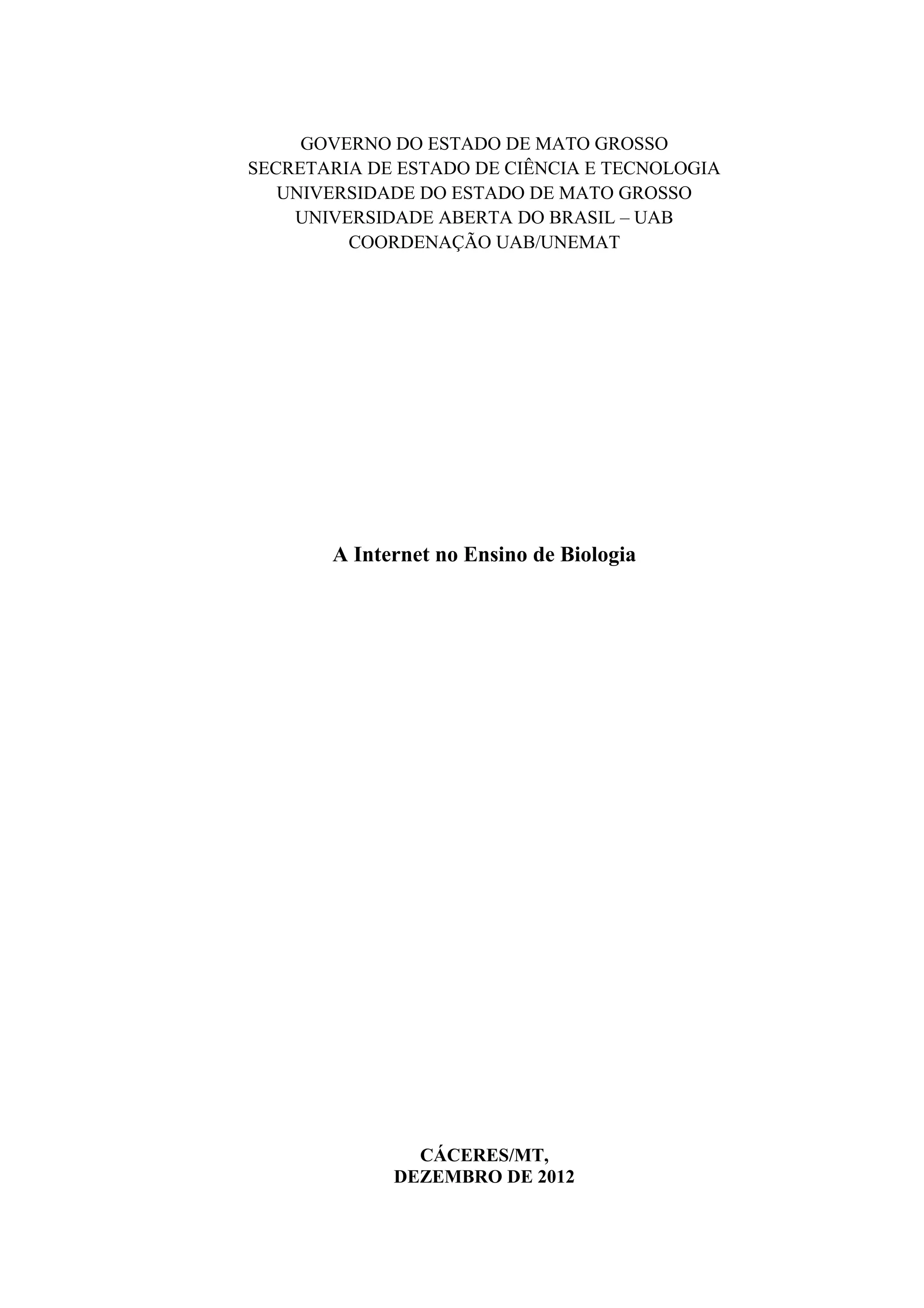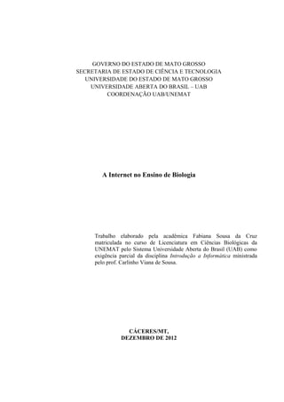 1) O documento discute como a internet pode ser usada para ensinar biologia, listando sites, softwares gratuitos, apostilas, vídeos, cursos, redes sociais e blogs como recursos úteis.