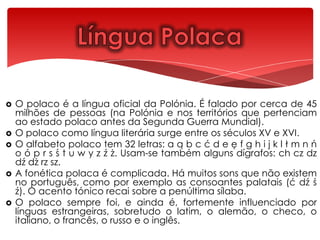 O polaco é a língua oficial da Polônia, falada por cerca de 45 milhões de pessoas. Surgiu entre os séculos XV e XVI e possui 32 letras em seu alfabeto, incluindo sons como as consoantes palatais que não existem no português. Sua fonética é complexa e sempre foi influenciada por línguas como o latim, alemão e russo.
